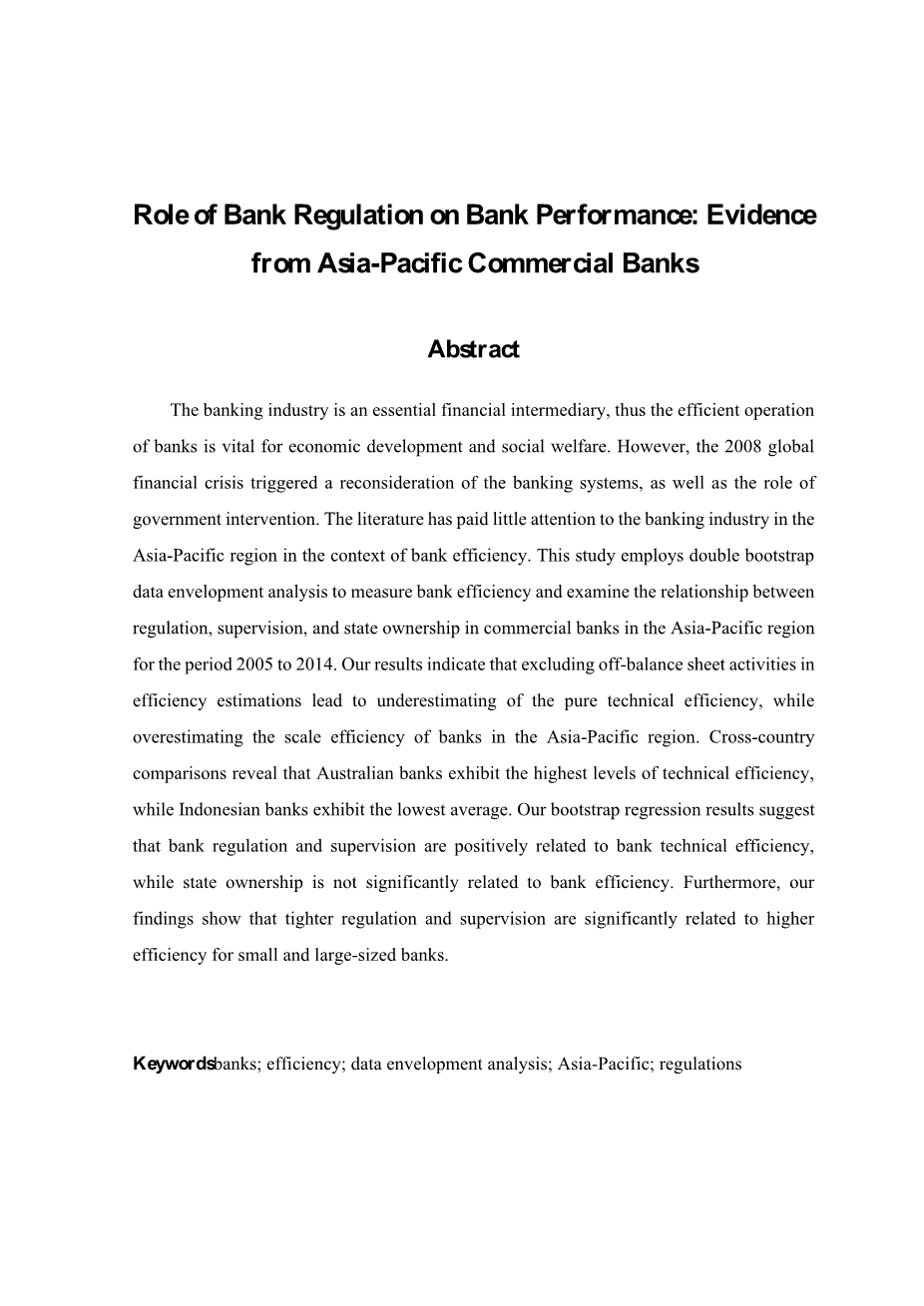 关键词 银行;效率;数据包络分析;亚太;规定