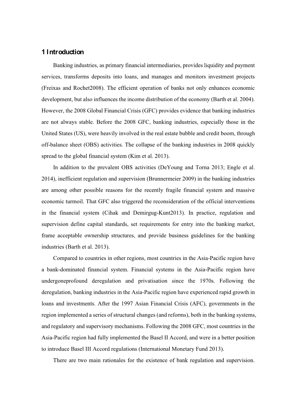 除了盛行的OBS活动(DeYoung和Torna,2013; Engle等,2014)外,银行业的监管不力(Brunnermeier,2009)是近期金融体系脆弱和经济动荡的其他可能原因。全球金融危机还引发了对金融体系官方干预措施的重新考虑(Cihak和Demirgug-Kunt 2013)。在实践中,监管和监督定义了资本标准,设定了进入银行市场的要求,制定了可接受的所有权结构,并为银行业提供了业务准则(Barth等,2013)。