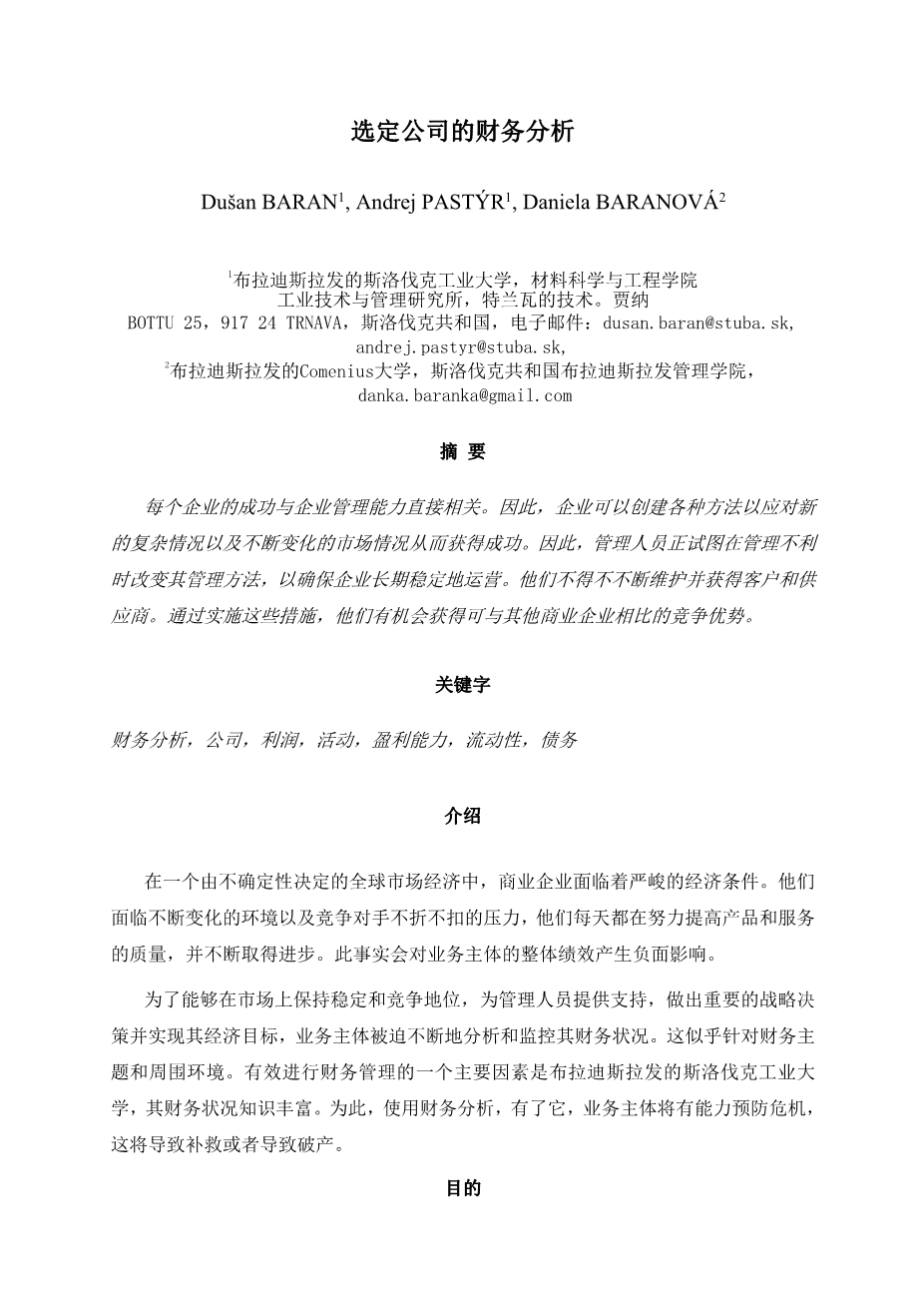 The business subject, in order to be able to maintain a stable and competitive position on the market, to provide inputs for the management, to make important strategic decisions and to achieve their economic goals, is forced to constantly analyse and monitor their financial situation with which appears towards financial subjects and the surroundingrsquo;s situation. A principal factor of effective financial management consist SLOVAK UNIVERSITY OF TECHNOLOGY in Bratislava, s of financial situation knowledge. For this purpose the financial analysis is used. With it the business subject will be capable to prevent the crisis, which would lead to remediation or even to bankruptcy.