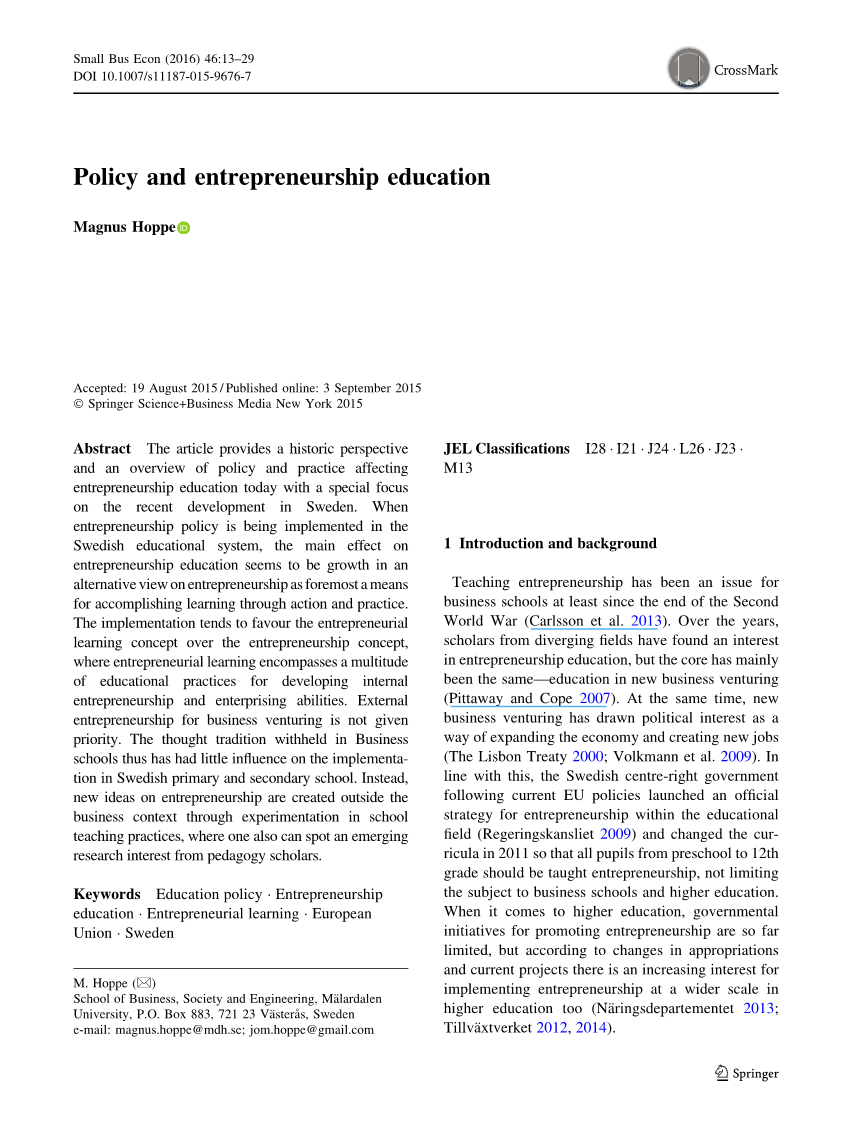 根据Pittaway的言论(2007,第500页),没有共识的创业教育,他们也说:“政策通常是不清楚什么输出时,要创建这样的教育是提升;而且,即使这些政策问题都解决了,我们不知道什么可行”。转向在这些问题上更明确的研究,我们还可以举出,如果政策背后的意图是通过创业创造经济增长,那么它不应该对教育(Arshed et al . 2014;梅森和棕色2013;巴蒂尔2009)和高增长公司的支持(2013年梅森和棕色)和创新组织(Acs et al . 2013年)。另一方面,如果政策是关于加强创业教育,应该首先旨在提高教育水平一般(Kolstad和韦格2014;Wennekers和Thurik 1999),其次支持创业教育环境(Falck et al . 2012;Falck和沃斯曼因2013)。当前研究相应的不给我们一个连贯的图片,实际上是企业家精神教育也不影响什么人能期望从正在进行的广泛实现在瑞典,这给了我们一些指导,我们可以期待从当前计划。我们这样问自己如何的瑞典实施欧盟政策创业家精神教育与当前的创业知识教育和影响呢?