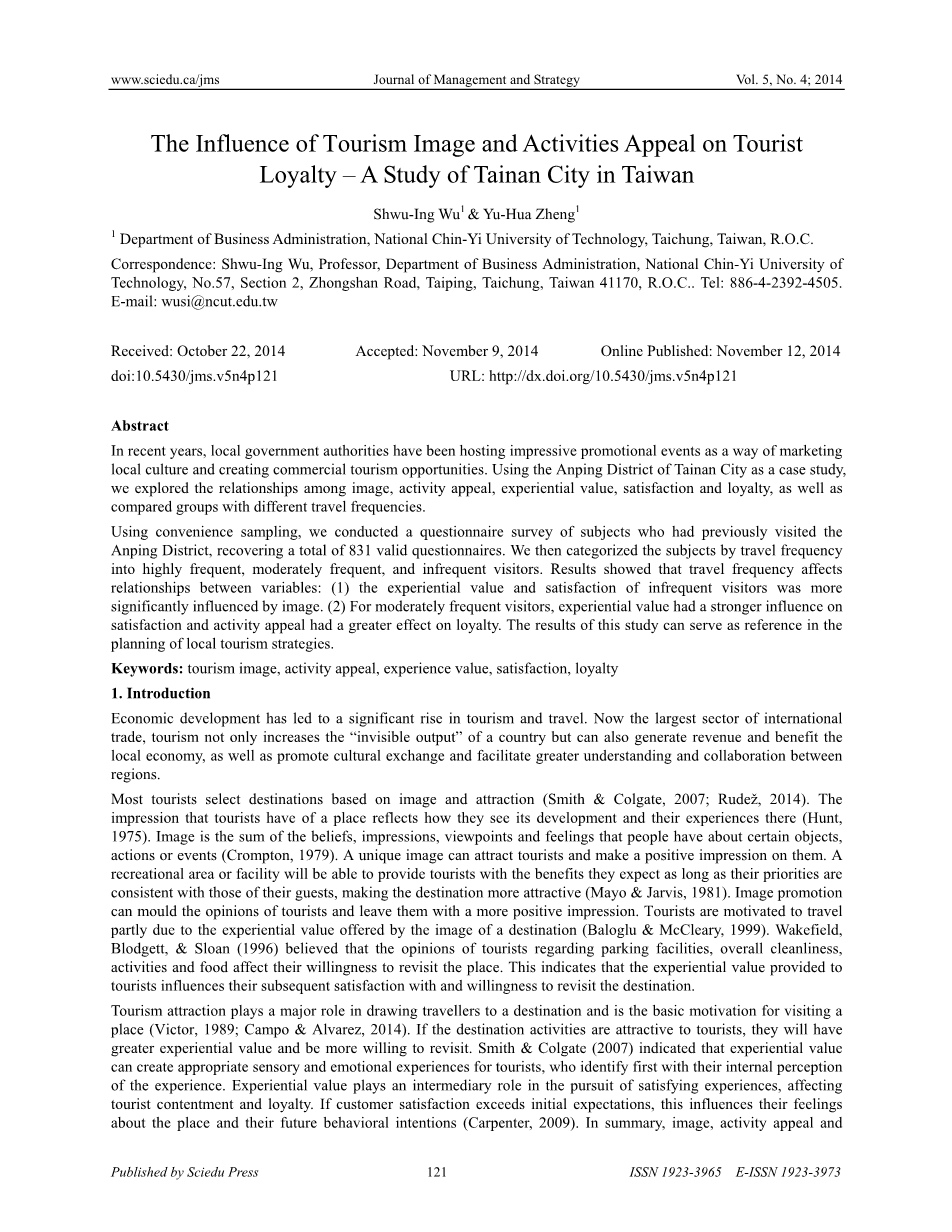 旅游形象与活动吸引力对旅游忠诚度的影响-台湾台南市研究外文翻译资料