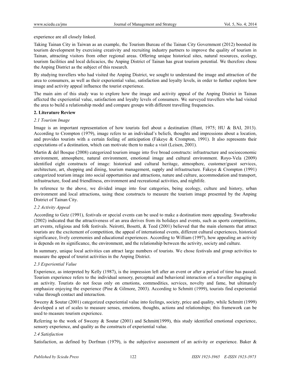 变量为形象的四个结构(自然生态、文化历史、城市环境和地方特色)和景点的两个结构(节日和集体活动)。我们讨论了形象和活动吸引力如何影响体验价值、满意度和忠诚度。