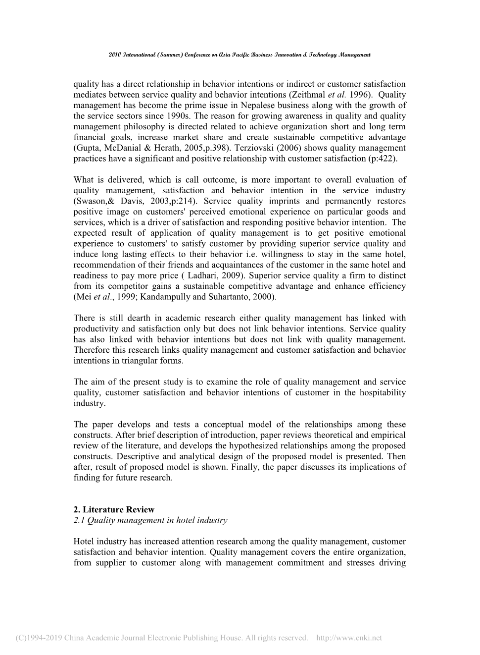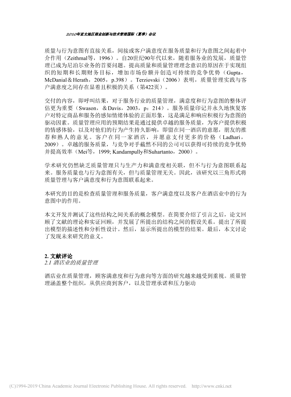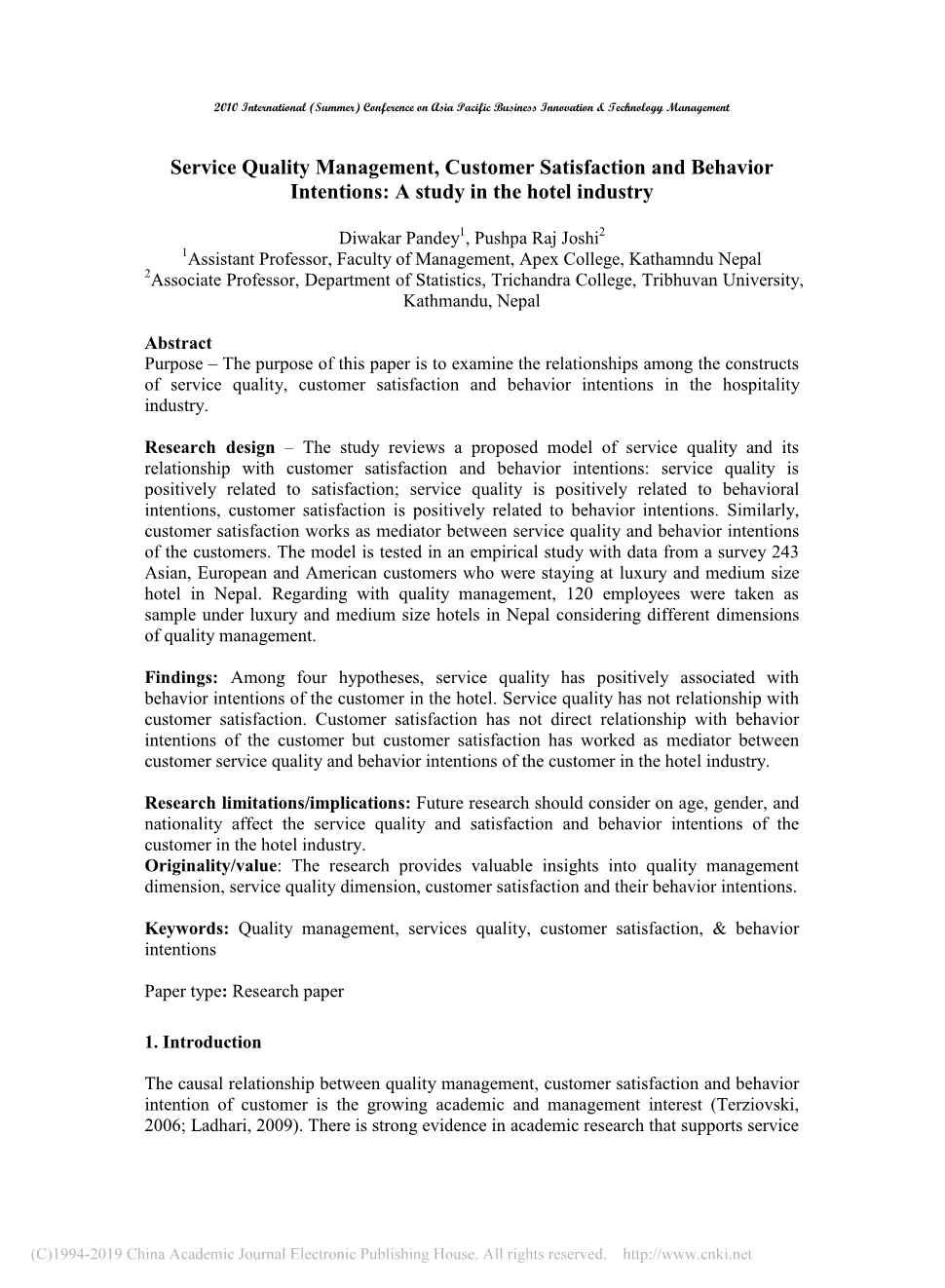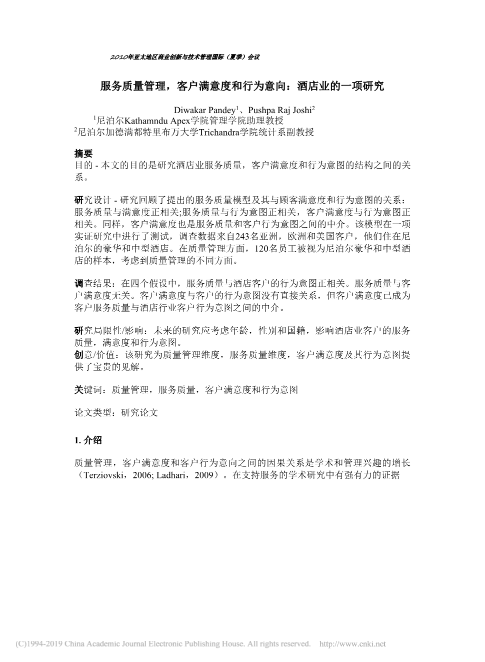 服务质量管理,客户满意度和行为意向:酒店业的一项研究外文翻译资料
