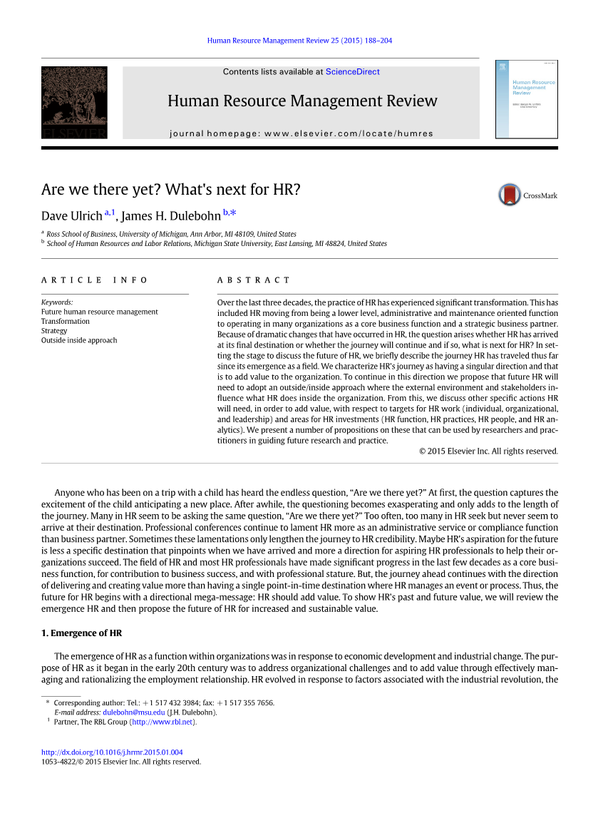 在过去三十年中,人力资源实践经历了重大转变。这包括人力资源从较低级别、面向行政和维护的职能转变为在许多组织作为核心业务职能和战略业务伙伴运作。由于人力资源发生了巨大的变化,问题是人力资源是否已经到达其最终目的地,或者旅程是否会继续下去,如果是的话,人力资源的下一步是什么?在讨论人力资源未来的舞台上,我们简要地描述了人力资源作为一个领域出现以来所走过的历程。我们把人力资源的旅程描述为有一个独特的方向,那就是为组织增加价值。为了继续朝着这个方向前进,我们建议未来的人力资源将需要采取一种外部/内部的方法,即外部环境和利益相关者影响人力资源在组织内部所做的事情。由此,我们讨论了人力资源需要采取的其他具体行动,以增加人力资源工作的目标(个人、组织和领导)和人力资源投资领域(人力资源职能、人力资源实践、人力资源人员和人力资源分析师)的价值。我们提出了一些关于这些问题的建议,可供研究人员和实践者用于指导未来的研究和实践。
