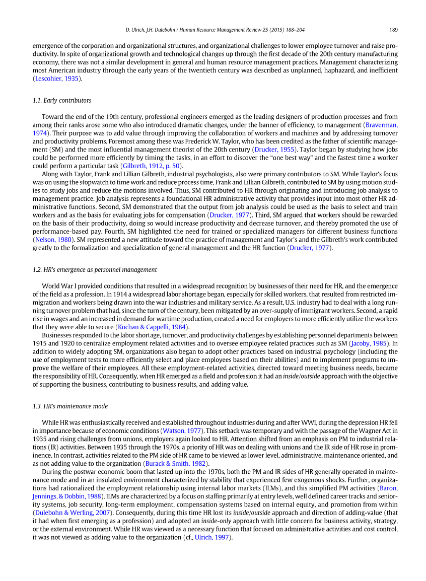 第一次世界大战提供了条件,使企业普遍认识到他们对人力资源的需求,并将该领域作为一种职业出现。1914年开始出现广泛的劳动力短缺,特别是对熟练工人的短缺,这是由于限制移民和工人被吸引到战争工业和兵役中来的。结果,工业必须处理一个长期的离职问题,自世纪之交以来,由于移民工人的过度供应而减轻了这一问题。其次,工资的快速增长和对战时生产的需求的增加使得雇主需要更有效地利用他们能够获得的工人。1984年企业应对劳动力短缺、更替和生产力挑战,在1915年至1920年期间成立了人事部门,集中开展与就业有关的活动,并监督与雇员有关的做法。1985年各组织还开始采用基于工业心理学的其他做法(包括使用就业测试,根据员工的能力更有效地选择和安置员工),并实施旨在证明员工福利的方案。所有这些与就业有关的活动,旨在满足商业需求,成为人力资源部的责任。因此,当人力资源作为一个领域和专业出现时,它有一个内部/外部的方法,目的是支持业务,促进业务成果,并增加价值。