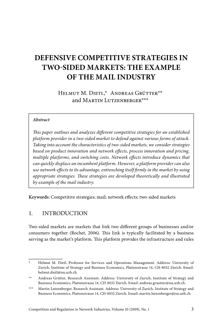 为了回答这个问题,第3节考虑了基于产品创新和网络效应、流程优化和定价、多平台和切换成本的防御策略。通过邮政业的例子说明了平台维护其地位的选项。邮件市场是传统的重要双边市场,已经得到了广泛的研究。此外,由于欧洲的邮件市场目前正在自由化,如何捍卫一个已建立的平台的地位是该行业的一个热门话题。