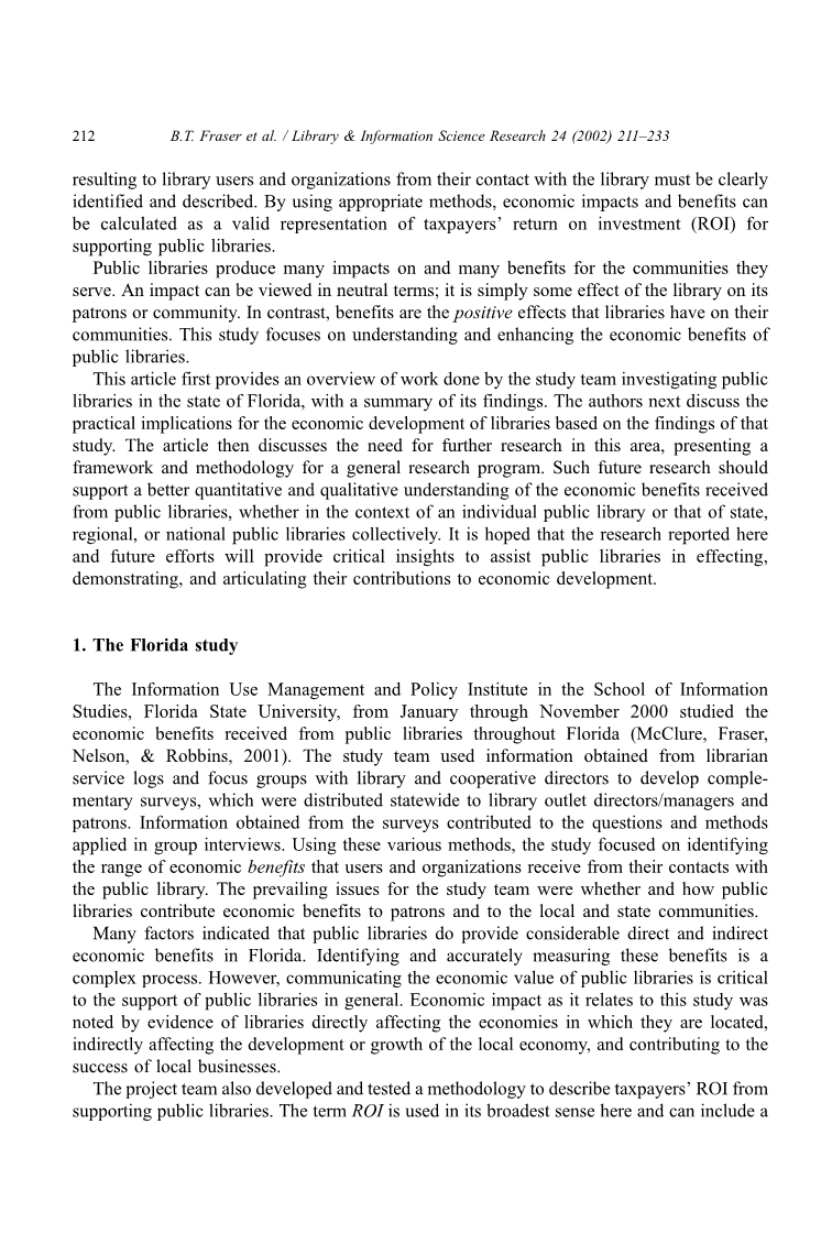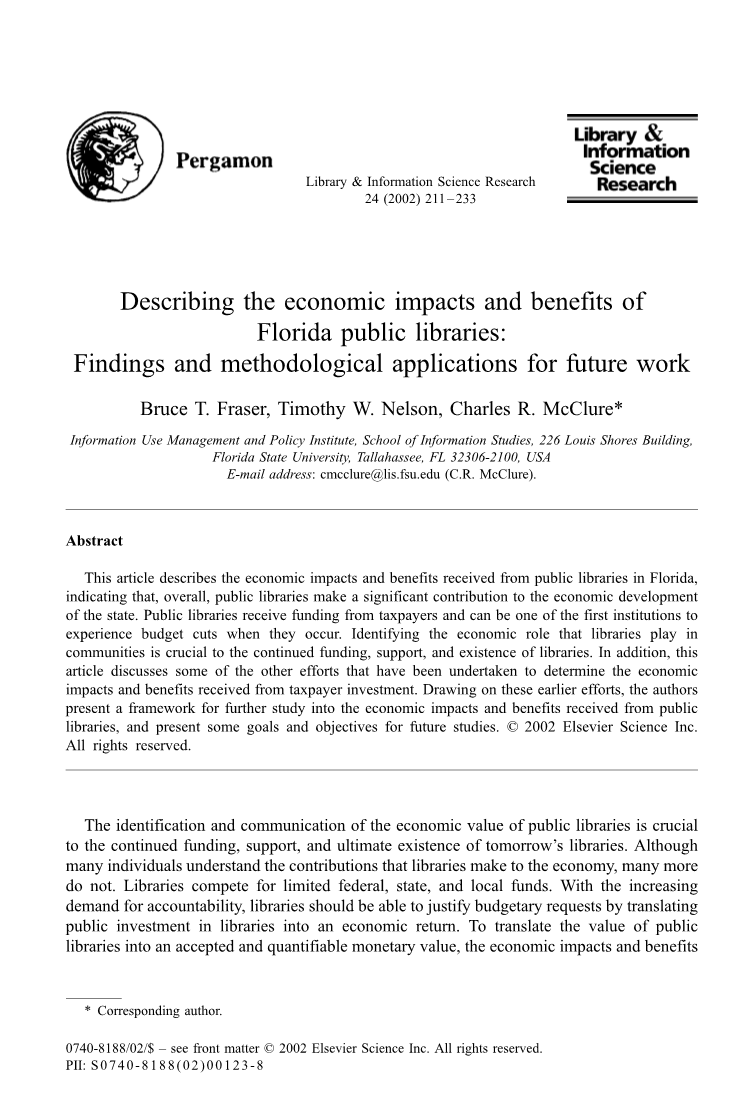 佛罗里达州立大学信息研究学院信息管理与政策研究所,从2000年一月到十一月研究整个佛罗里达州从公共图书馆获得的经济效益(McClure,Fraser,