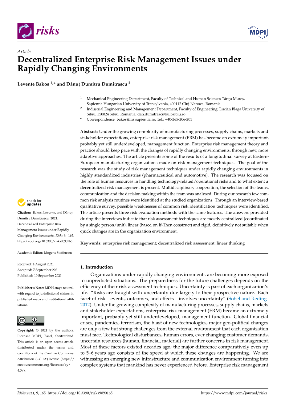在快速变化的环境下出现的分散化企业风险管理问题外文翻译资料