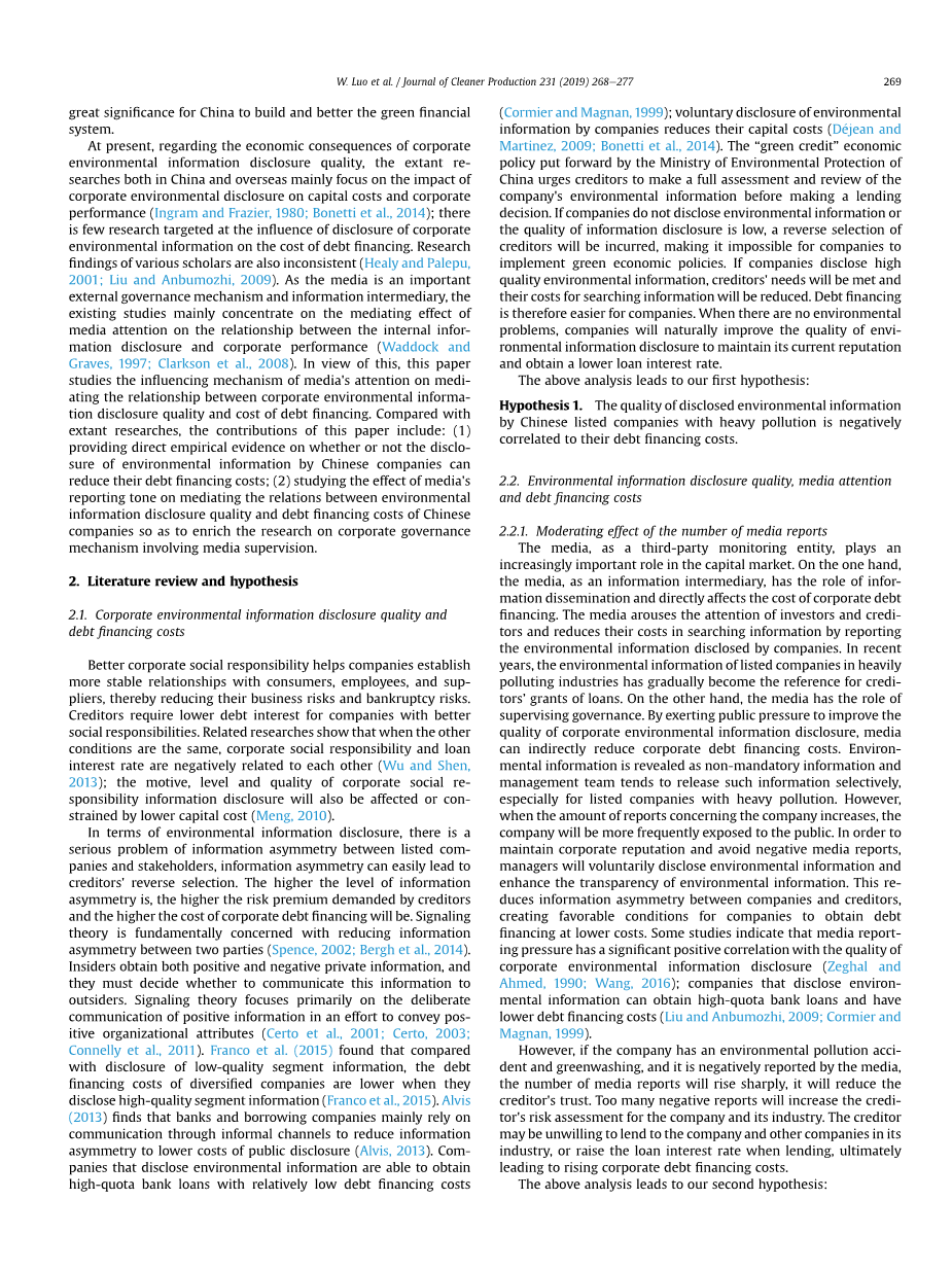 这减少了公司和债权人之间的信息不对称,为公司以较低的成本获得债务融资创造了有利条件。 一些研究表明,媒体报道压力与企业环境信息披露质量有显著正相关 (Zeghal and Ahmed, 1990; Wang, 2016);披露环境信息的公司可以获得高额度的银行贷款,并降低债务融资成本(Liu and Anbumozhi, 2009; Cormier and Magnan, 1999).