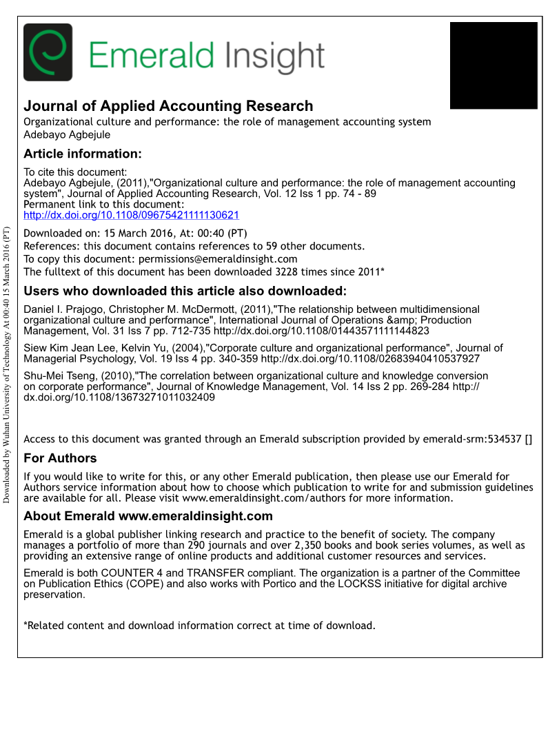 2.引言:组织文化和绩效水平之间的联系已经受到了研究组织文化的诸多学者们的广泛关注(如戈登和迪托马索,1992;黎姆1995;奥邦纳和海瑞斯2000;亨利2006)这种观点主要讨论的是当一个组织通过展示一个整合良好且切实有效的特殊价值观、信念和行为能否保证该组织文化的强大影响力,同时这种影响力还会在执行过程中产生一个更高乘此的生产力(索罗森2002)。此外,斯托伊卡等人在2004年的研究中讨论了文化和绩效水平之间的关系会受到组织搜集和使用管理会计信息的方式的影响。