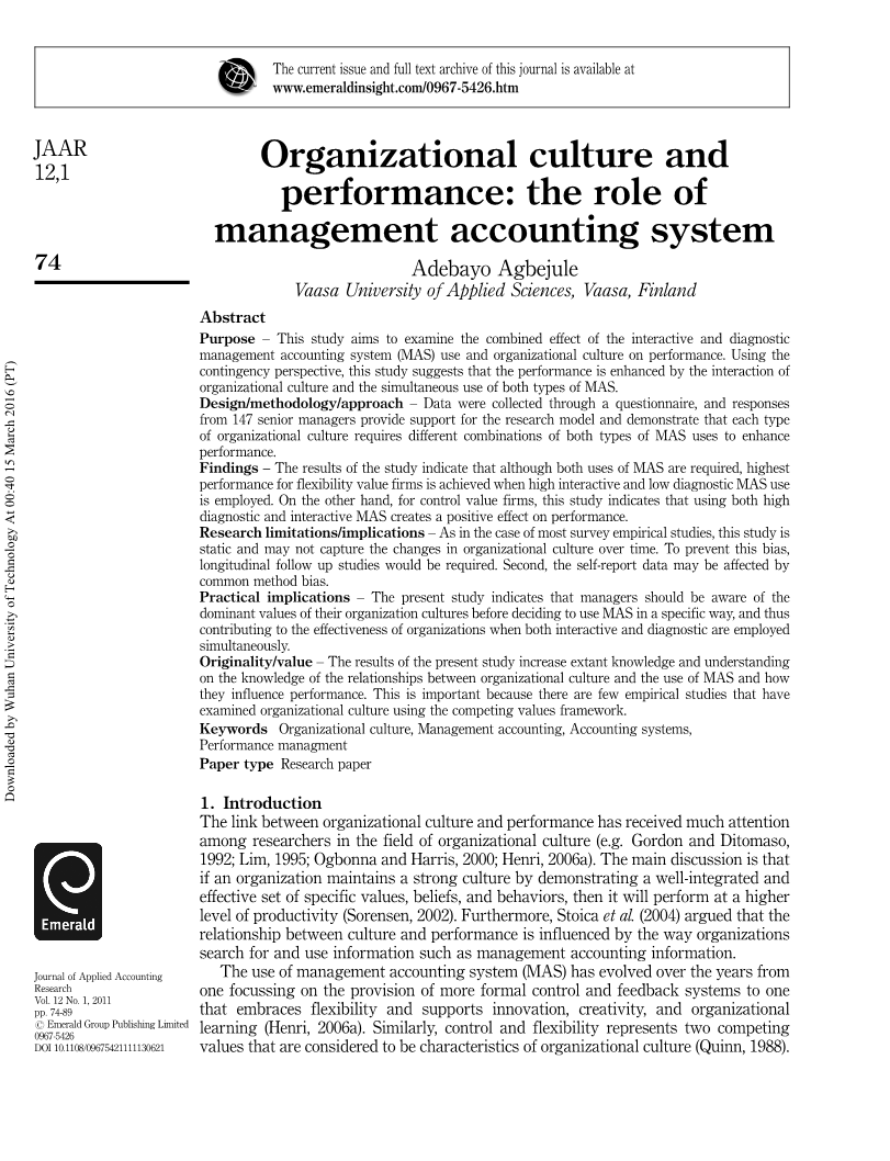 组织文化和绩效:在管理会计系统中的角色
