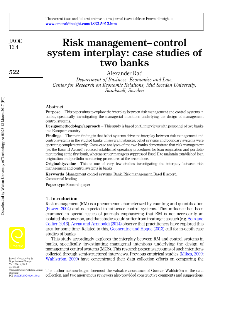 风险管理(RM)是一种以计数和量化为特征的现象(Power,2004),预计会影响到控制系统。这些影响已经在特刊期刊上进行了研究,强调RM不一定是孤立的现象,研究可能会受到诸如此类的影响(例如Soin和Collier,2013)。Arena和Arnaboldi(2014)观察到,从业者已经探索了这个地区一段时间。与此相关的是,Gooneratne和Hoque(2013)呼吁深入银行案例研究。