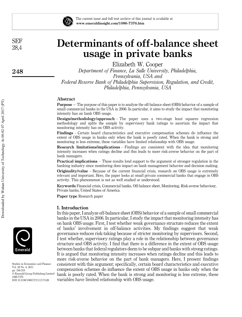 目的:本文的目的是分析2006年美国小商业银行样本的表外(OBS)行为。特别是研究监控强度对银行OBS使用的影响。