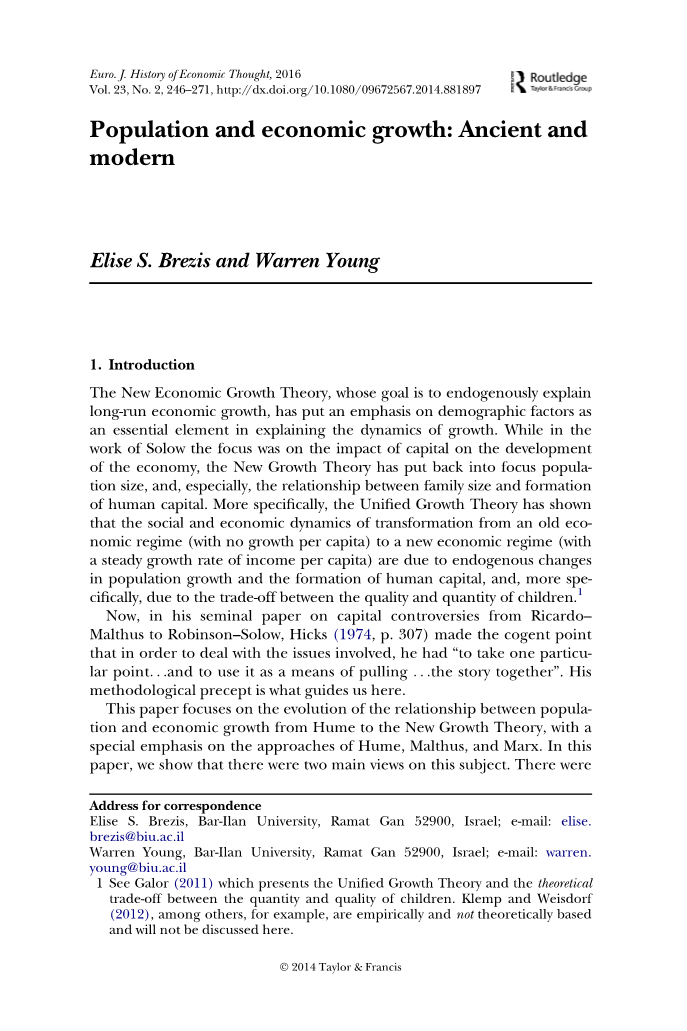 摘要:本文重点研究了从休谟理论到新增长理论的人口与经济增长关系的演变。在本文中,我们认为这个主题有两个主要观点。有些人认为生育率和收入之间的关系是积极的。另一方面,有人提出这种联系没有发生的可能性,他们强调收入的增加并不一定导致生育更多的孩子。根据希克斯的方法论原则,该论文将表明他们在这个问题上的立场与社会经济事实有关:同胞的规模效应。我们认为,那些认为收入增加导致生育更多孩子的愿望的人并没有考虑到同胞的规模效应,而那些认为存在负面关系的人在他们的效用中发挥作用就是一种同胞规模效应。