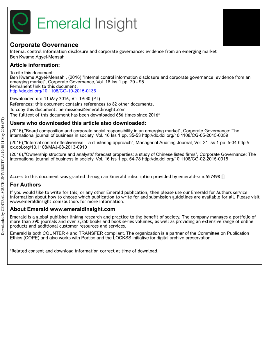 摘要:本研究的目的是增加我们对企业的影响的理解加纳公司内部控制信息披露的治理因素。选用在加纳的110家公司在加纳的一个数据集为2013的年用。每个年度报告单独审查和编码,以获得内部披露控制信息索引。描述性分析,提供背景统计检验变量。其次是回归分析,形成的主要数据分析方法。结果表明:内部控制信息披露的结果表明,平均为35元大多数的抽样公司没有透露足够的内部控制信息,在他们的年度报告。低层次的内部控制信息披露不能被使用的利益相关者来确定抽样企业的公司治理水平。回归的结果分析表明,董事会独立性是一个显着的变量,解释了披露内部控制披露。这支持一般认为独立董事有助于提高信息披露质量,提高信息透明度。独创性/价值-这是在加纳的第一项研究,认为公司治理的影响内部控制信息披露的影响因素。这项研究有助于文学的公司治理与披露之间的关系显示,内部披露在加纳的控制信息与独立董事会成员的比例。这研究结果支持了萨班斯法案(SOX)–奥克斯利404的要求,即使这不是强制性的加纳公司与他们的美国同行。这项研究的结果将有助于市场监管机构在加纳和撒哈拉以南的非洲,安全和交换委员会(美国证券交易委员会)和撒哈拉以南的地区评估在他们的国家的现行披露规定的充分性的非洲交流。了解董事会构成及其对自愿性信息披露的影响在撒哈拉以南的公司治理代码中的董事会的充分性非洲国家。