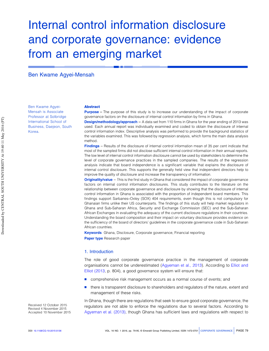 公司治理与披露之间的关系显示披露在加纳的控制信息与独立董事会的比例成员。本研究结果支持美国–奥克斯利(SOX)404的要求,即使这是不是强制性的加纳的公司与他们的美国同行。