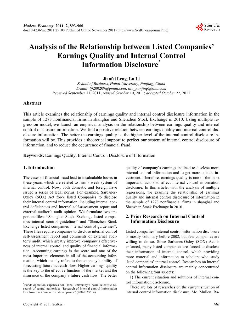 近年来金融诈骗案件的发生带来了不可估量的损失,这与公司内部控制系统弱是有关系的。目前,国内外相继颁布了一系列法律规范。例如,《萨班斯-奥克斯利法案》(SOX)要求股票上市公司披露内部控制信息,包括内部控制的缺陷,内部的自我评估报告以及外部审计师的审计意见等。我们国家也制定了两个重要的文件:《上海证券交易所股票上市公司内部控制指导方针》和《深圳证券交易所股票上市公司内部控制指导方针》。这些文件要求公司披露内部控制自我评价报告和外部审计师的审计意见,从而大大提高了公司内部控制与财务信息质量的有效性。会计盈余是一个得分点,也是所有的会计信息中最重要的元素之一,它主要影响公司预测未来净现金流的能力。较高的盈利质量是市场有效运行的关键和公司未来现金流量的保障。公司的盈余质量越好,披露的内部控制信息越多,获得的外部投资也越多。因此,盈余质量是影响内部控制信息披露的一个重要因素。在本文中,我们以2010年上海证券交易所和深圳证券交易所的1273家非金融公司为样本,通过多元回归分析,研究盈余质量与内部控制信息披露的关系。