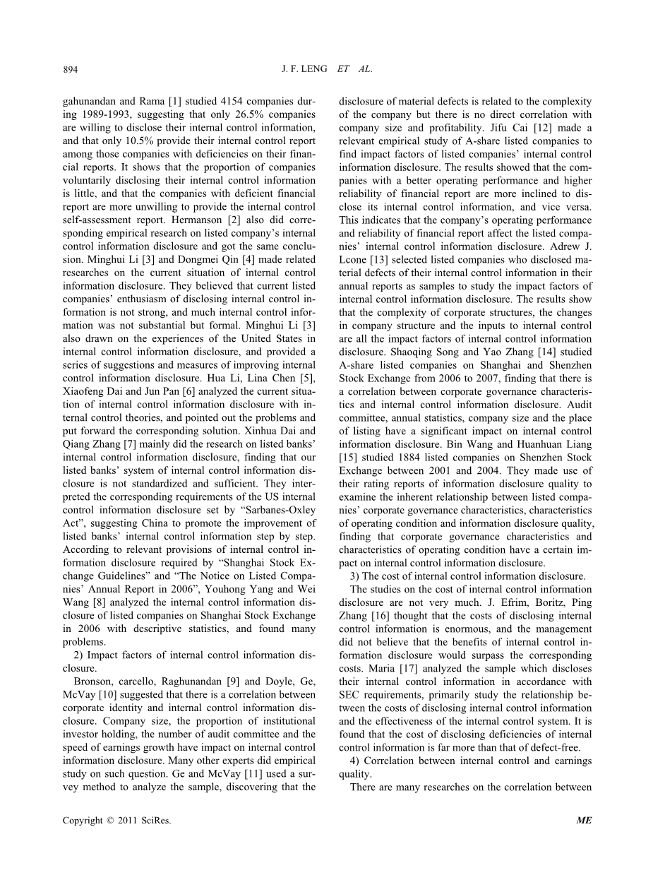布朗森,卡瑟罗,Raghunandan和多伊尔,GE,麦克维认为企业形象与内部控制信息存在一定的相关性。公司规模,机构投资者持股比例,审计委员会的数量和收入增长的速度都会对内部控制信息披露造成影响。许多其他专家对这样的问题也进行了实证研究。Ge和麦克维采用问卷调查法分析样本,发现虚假材料的披露与公司的复杂性有关但与公司规模和盈利能力是没有直接关联的。蔡吉福为了找出上市公司内部控制信息披露的影响因素对A股股票市场上市公司进行了相关的实证研究。结果表明,一个拥有良好经营业绩和财务报告可靠性较高的公司更倾向于披露内部控制信息,反之亦然。这表明,公司的经营业绩和财务报告的可靠性对股票上市公司内部控制信息披露存在一定的影响。安德鲁J·Lcone选择在其年度报告中披露内部控制重大缺陷信息的股票上市公司作为样本,以研究内部控制信息披露的影响因素。结果表明,企业组织结构的复杂性,公司结构的变化和内部控制的输入都是内部控制信息披露的影响因素。宋少卿和张尧对2006年至2007年上海证券交易所和深圳证券交易所A股市场上的上市公司进行研究,发现公司治理特征与内部控制信息披露是有关系的。审计委员会,年度统计数据,公司规模和上市地点对内部控制信息披露都有重大影响。王斌,梁欢欢对2001年至2004年深圳证券交易所的1884家股票上市公司进行了研究。他们利用他们信息披露质量的评级报告来研究股票上市公司的公司治理特征,操作条件特征与信息披露质量特性之间的内在关系,发现公司治理特征和操作条件特征对内部控制信息披露有一定的影响。