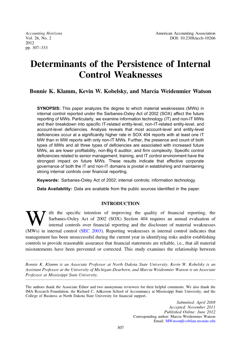 当前内部控制机制的存在和性质是相互关联的。由审计人员、信用评级机构和投资者对收益和评估的质量进行评估。在特别是,与内部控制有效的公司相比,拥有MWs的公司的成本更低。盈利能力、盈余质量、收益-收益关系、审计委员会质量和股票市场申报表及较高的审计费用。这些影响取决于MW的性质。例如,拥有与IT相关的MWs(以下简称IT MWs)的公司比非IT相关MWs的公司(以下简称非IT MWs)具有更低的管理收益预测,特别是对于与数据处理完整性有关的IT MWs而言。此外,实体级别的MWs与较低的应计利润相关联。质量,审计师持续经营的评估,以及较低的三天市场回报,而客户级别的mw不是。