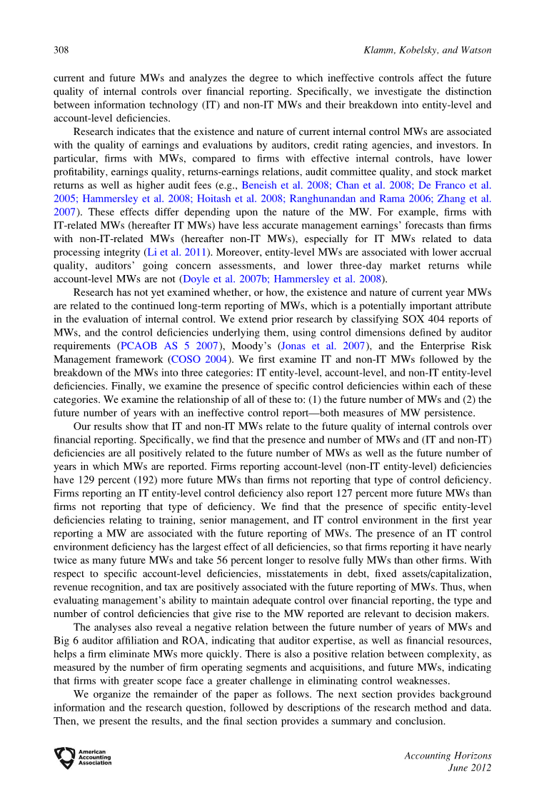 对IT MWs的影响的研究提供了实施强大IT控制的重要性的证据。具体来说,至少有一个IT MW的公司往往有更多的非IT MWs,与拥有非IT MWs的公司相比,更多的错报、更低的资产回报率、更高的审计费用以及较低的管理收益预测(Klamm和Watson,2009年;加拿大等)。2009年;Li等人。2011年)。IT MW公司的高管更替率也较高(Masli等人)。(2011年),这可能预示着最重要的问题。实验研究发现,IT实体级控制中的MWs与非专业投资者对未来股价的较低估计有关,但对专业投资者的估计没有影响(Arnold等人)。2011年)。专业人士的这一反应可能在一定程度上归因于这样一种假设,即IT MWs不是持久的。我们的研究为IT MWs的长期效应提供了经验证据。