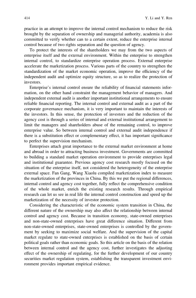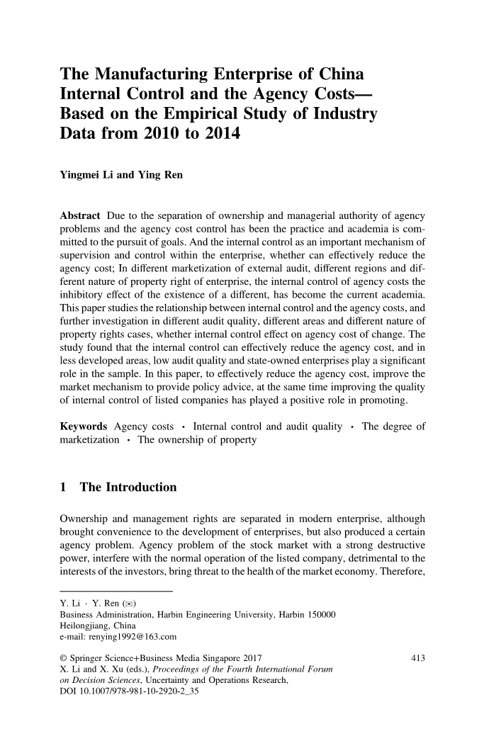 中国的制造企业内部控制和代理成本 —基于行业的实证研究从2010年到2014年的数据 (Yingmei Li and Ying Ren)外文翻译资料