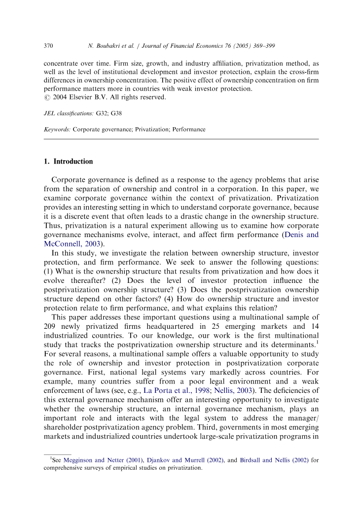 摘要:研究股权结构和投资者保护在后民营化公司治理中的作用。在1980至2001年间,我们使用了来自39个国家的209家私有化公司的样本,我们发现政府放弃了对当地机构、个人和外国投资者的利益的控制,私人所有权往往会随着时间的推移而集中。公司规模、增长和产业关联、私有化方法以及制度发展水平和投资者保护,解释了股权集中度的跨公司差异。股权集中度对企业绩效的正向影响在投资者保护弱势的国家更为显著。