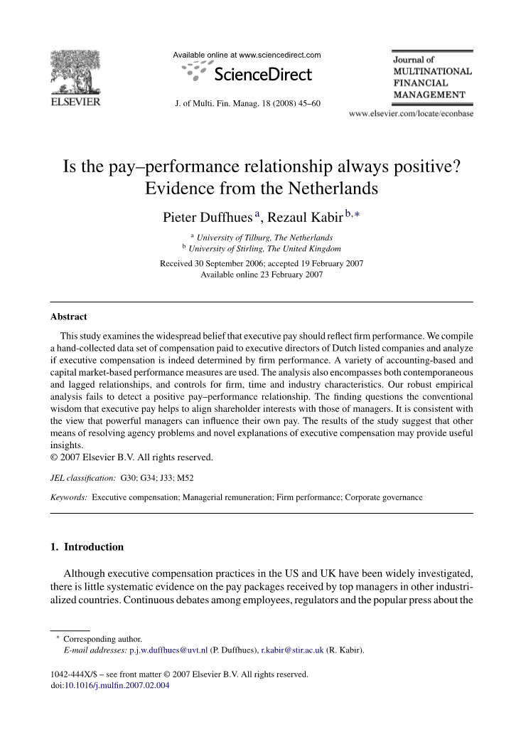 这项研究针对一个普遍证实的结论:高管薪酬应反映公司业绩。我们编制了一份由荷兰上市公司执行董事收集的薪酬数据,并分析了高管薪酬是否确实取决于公司业绩。使用多种基于会计和资本市场的业绩衡量标准。分析还包括同期和滞后的关系,公司的内部控制,考虑了时间和行业特点。我们稳健的实证分析未能发现一个积极的薪酬-绩效关系。这一发现质疑了传统的观点,即高管薪酬有助于将股东利益与管理者的利益相一致。这与“强大的管理者可以影响自己的薪酬”这一观点一致。研究结果表明,解决代理问题的其他方法和对高管薪酬的新解释,可以对这一现象提供有用的见解。