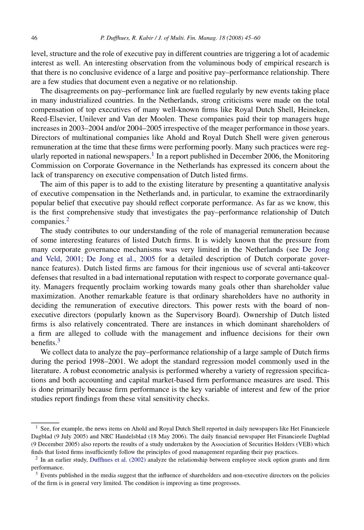 由于荷兰上市公司的一些有趣的特点, 这项研究有助于我们理解管理薪酬机制的作用。众所周知, 许多公司治理机制的影响力在荷兰非常有限。(De Jong and Veld, 2001; De Jong et al., 2005 for a detailed description of Dutch corporate governance features)荷兰上市公司因巧妙地使用了一些反收购防御而闻名于世,这导致了公司治理质量方面的国际声誉不佳。管理者经常宣布除了股东价值最大化以外的其他目标。另一个显著的特点是普通股东无权决定执行董事的薪酬。这一权力由非执行董事(俗称监事会)董事会负责。荷兰上市公司的所有权也相对集中。在某些情况下, 公司的主要股东被指与管理层和影响决定串通, 以利其自身利益。