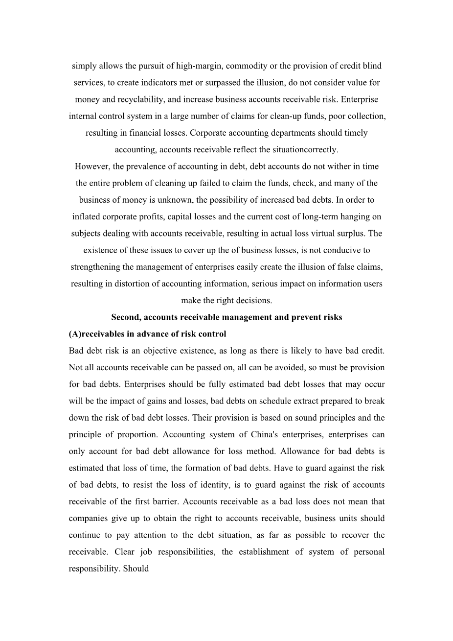 要促进企业的销售,加快收集,支付一定的成本,必须为客户提供一定程度的信用条件。在确定客户的信用条件事,企业必须确保客户的信用条款提供给企业带来的好处大于信用成本。如果信用期太长,现金折扣盲目,或折扣率确定不合理,所有的信用公司都只会增加成本和提高应收账款回收风险和回收成本,不利于企业的发展。一些中小企业缺乏一批专职机构从事应收账款风险管理,缺乏健全有效的客户档案和专业人员信用评级、信用额度和信用控制,没有对坏账风险事前、事中和事后的预防和控制。许多企业实行工资与效益挂钩的经营模式,让经营者只追求高利润,盲目赊销商品或提供的服务,创建达到指标或超过指标的假象,不考虑资金价值和可收回性,并提高企业应收账款风险。企业内部控制系统中对大量的资金清理,收集不全,造成资金损失。公司财务部门应及时核算、正确反映应收账款情况。然而,在财会中普遍存在债权、债务账务凋整不及时问题,对债权资金未能及时清理、核对,许多款项的业务内容不详,加大了呆账的可能性。企业为了虚增利润,将当期资本损失和长期费用挂在应付账款科目上,造成实际损失的虚拟盈余。这些问题的存在掩盖了企业的亏损,不利于加强对企业的管理,容易造成虚假债权的假象,造成会计信息失真,严重影响了信息使用者的正确决策。