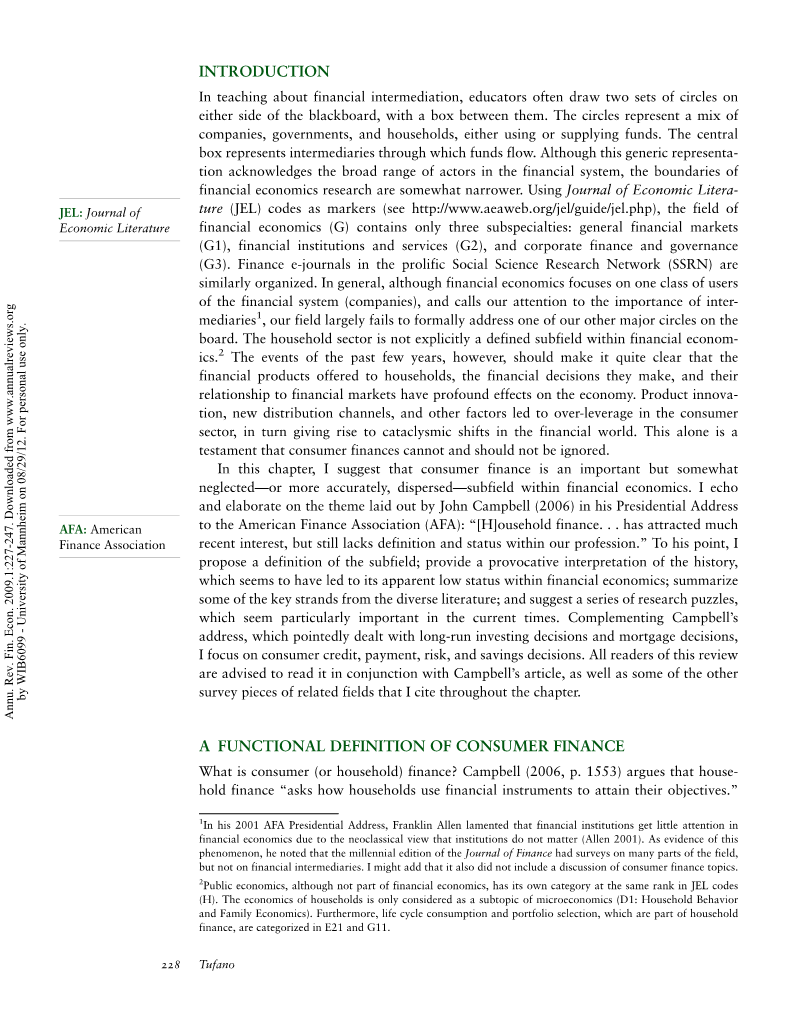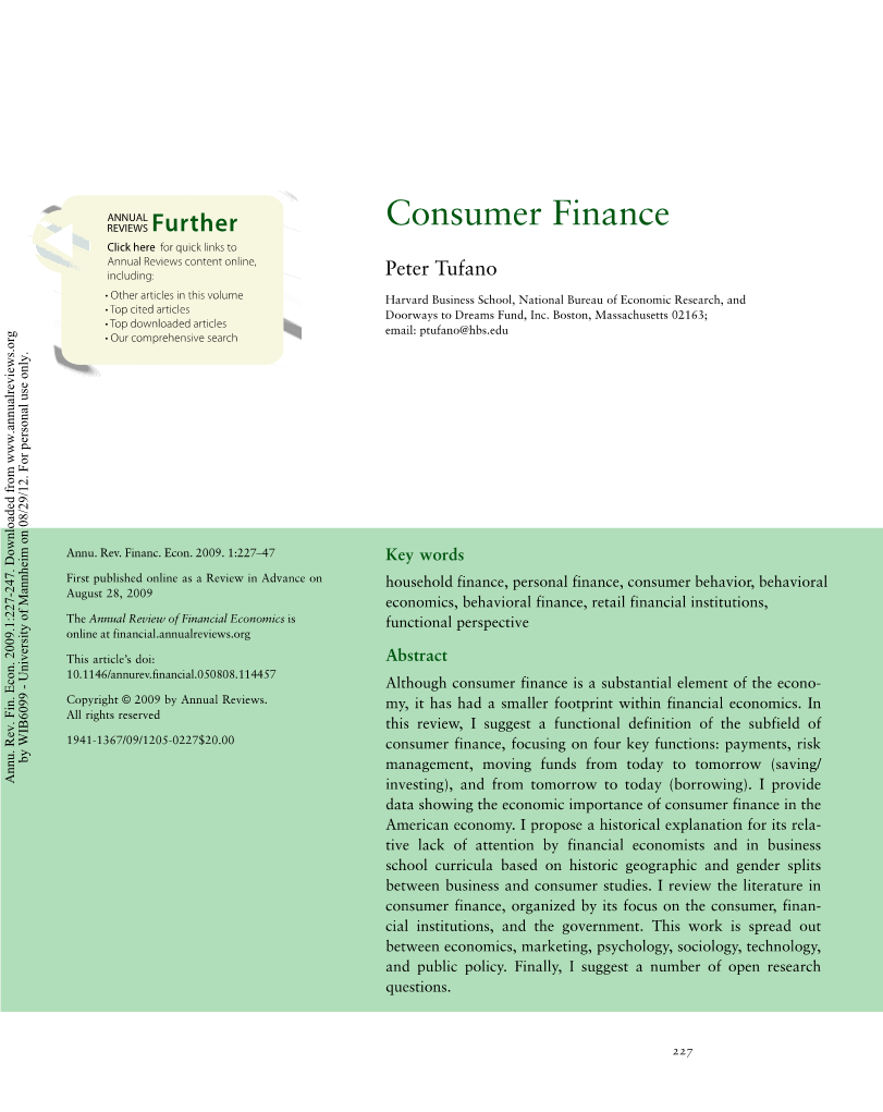 摘要:尽管消费者金融是经济的重要组成部分,但其在金融经济中的占地面积较小。 在这篇综述中,我提出了消费金融子领域的功能定义,重点关注四个关键功能:支付,风险管理,从今天到明天(储蓄/投资)以及从明天到今天(借款)的资金转移。 我提供的数据显示了消费金融在美国经济中的经济重要性。 我对金融经济学家和商学院课程相对缺乏关注的历史性解释提出了基于商业与消费者研究之间历史地理与性别分裂的观点。 我回顾消费者金融方面的文献,重点关注消费者,金融机构和政府。 这项工作分散在经济学,市场营销,心理学,社会学,技术和公共政策之间。 最后,我提出了一些开放性的研究问题。
