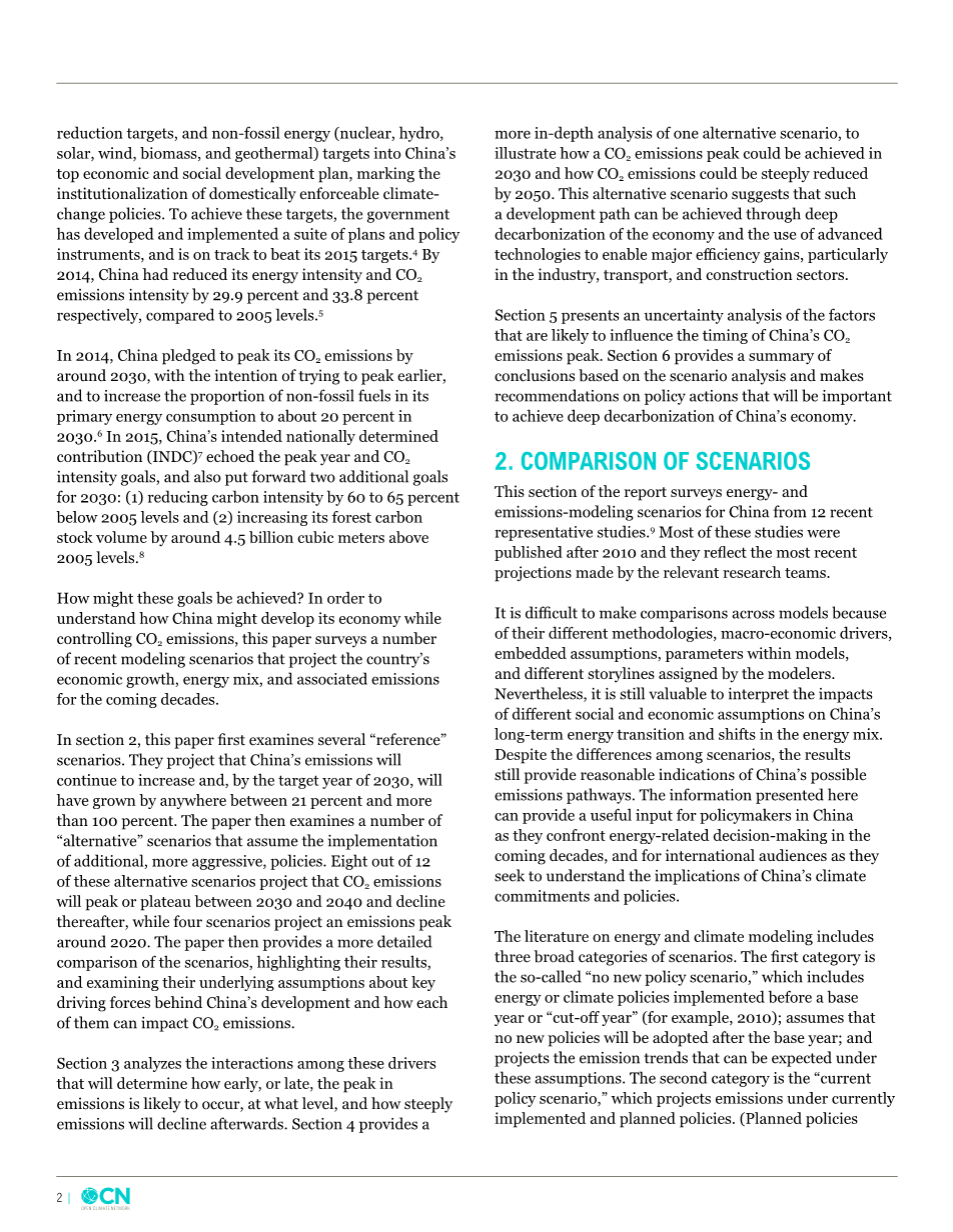 在第2节中,本文首先研究了几个“参考”情景。他们预计,中国的排放量将持续增加,到目标年2030年,将增长21%至100%以上。然后,本文研究了一些“可选”情景,这些情景假设执行额外的、更强势的策略。在这12个备选情景中,有8个在2030年到2040年之间达到峰值或停滞期,随后下降,而四种方案预计在2020年左右排放达峰。然后,论文对这些情景进行了更详细的对比,强调了它们的结果,并分析了它们对中国发展背后的关键驱动力的假设,以及它们怎样影响二氧化碳的排放。