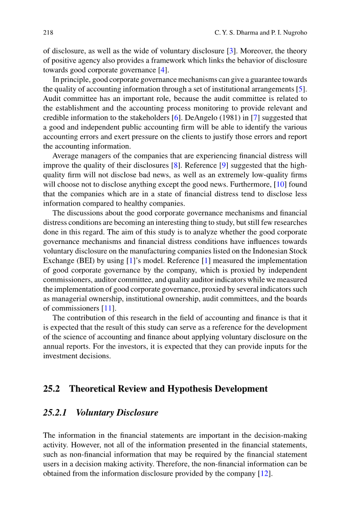 关于公司治理机制和财务危机情形的研究很有趣,但是这方面的研究仍较少。本文的研究目的是:利用文献[1]中的模型,分析良好的公司治理机制和财务危机情形对印尼证券交易所上市的制造业公司的自愿的信息披露是否有影响。文献[1]中为了衡量管理层持股、机构投资者持股、审计委员会、董事会等几个影响公司治理出色与否的关键因素,对公司董事的独立性、审计委员会及审计的质量进行了判断。
