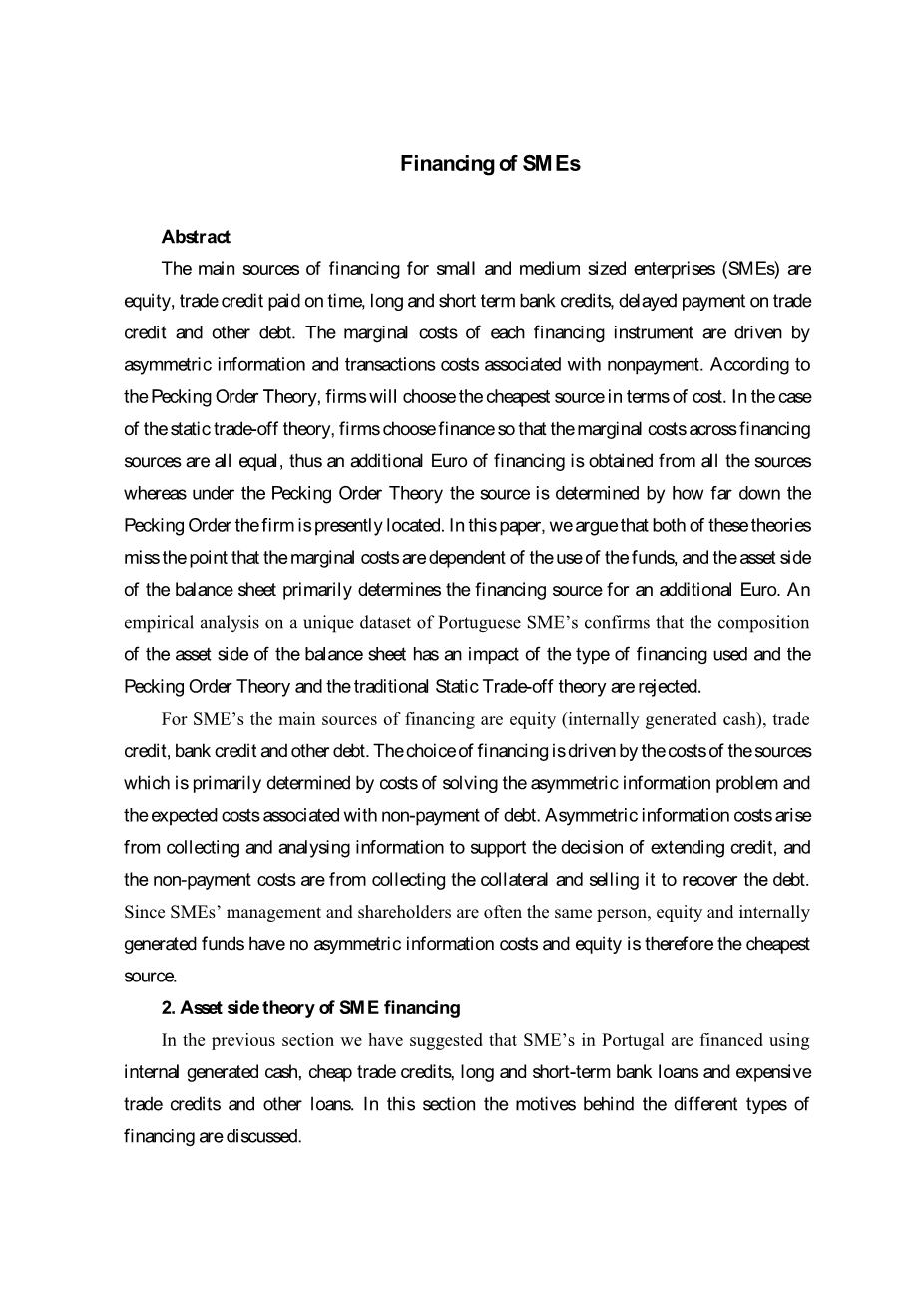 中小企业的融资主要来源于股权(内部融资),贸易信贷,银行信贷和其他债务。融资的选择是由成本的来源,这主要取决于解决信息不对称问题和预期的成本与非支付的债务。信息不对称产生的信息成本来自收集和分析信息,以支持扩大信贷的决定,而非支付费用是从收集抵押品和出售其收回债务。由于中小企业的管理和股东往往是同一个人,股权和内部产生的资金没有非对称的信息成本和股权,因此股权融资是成本最低的融资渠道。