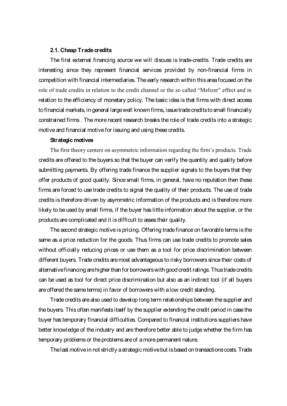 我们将讨论的第一个外部融资来源是贸易信贷。贸易信贷是有趣的,因为它们代表非金融企业在金融中介机构的竞争中提供的金融服务。在这方面的早期研究主要集中在贸易信贷的作用,在信贷渠道或所谓的“梅尔泽”效应,并在关系到货币政策的效率。基本的想法是,企业直接进入金融市场,在一般大的知名企业,发行贸易信贷的小资金约束的公司。在最近的研究中,将对贸易信贷的利用分为战略动机和财务动机。