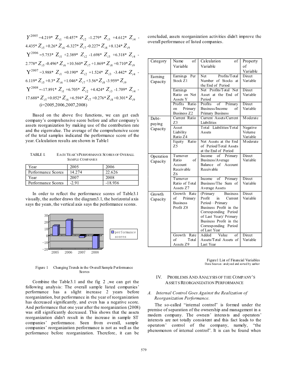 本文通过回归分析,将9个2007年(2005年-2008年)进行资产重组的ST 公司的财务变量进行比较。用这种方法,可以检查中国上市公司资产重组绩效的改变状况。利用Matlab.5.0软件,对发生重组的上市公司重组前两年及后两年的财务变量进行回归分析,我们可以得到5个多样评分函数。