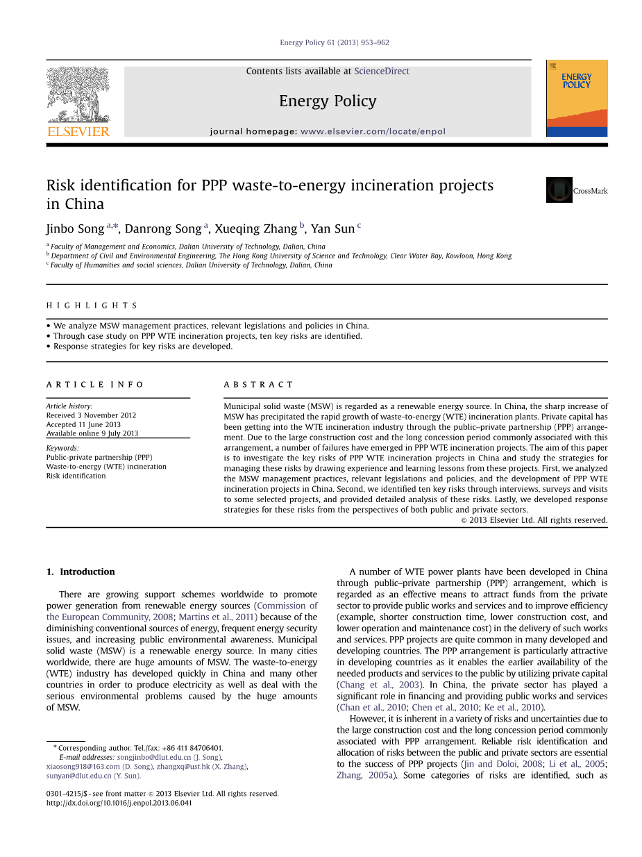 中国垃圾焚烧发电PPP项目风险识别外文翻译资料