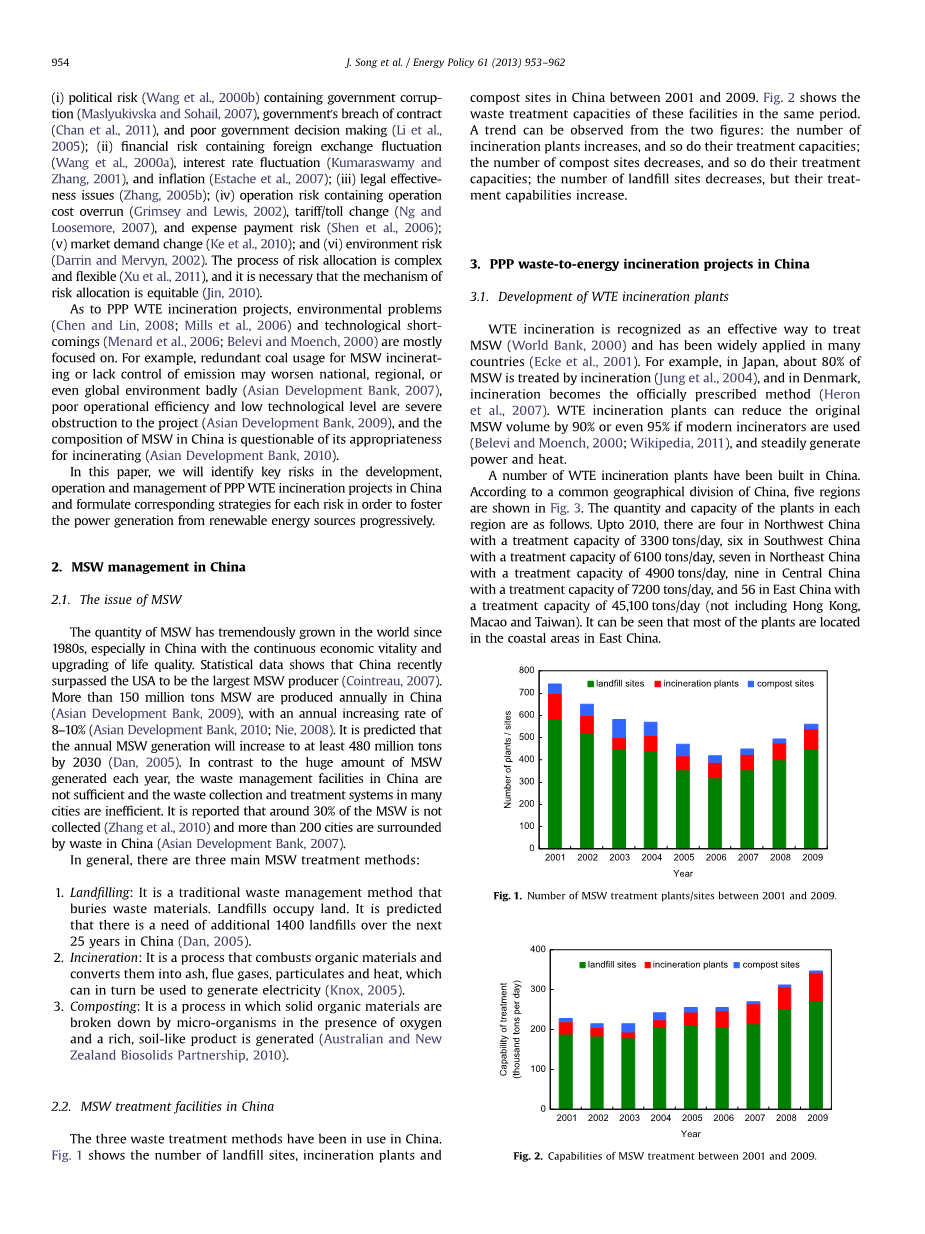 英语原文共 10 页,剩余内容已隐藏,支付完成后下载完整资料 中国垃圾焚烧发电PPP项目风险识别 摘要 城市固体垃圾(MSW)被视为可再生能源。在中国,随着城市固体垃圾的急剧增加,垃圾焚烧发电厂的数量也在快速增多。通过政府和社会资本合作(PPP)模式,社会资本正逐渐进入了垃圾焚烧发电行业。由于施工成本较高,建设周期较长,垃圾焚烧发电PPP项目也出现了许多失败的案例。本文的目的在于识别中国垃圾焚烧发电PPP项目的主要风险,研究相应的风险管理策略,并从这些项目中吸取经验教训。首先,我们分析了城市固体垃圾管理的实际情况,相关法律和政策,以及中国垃圾焚烧发电PPP项目目前的发展状况。二是通过对某些特定项目的调查研究,确定了十大关键风险,并对这些风险进行了详细分析。最后,我们从政府和社会资本的角度制定了相关的风险应对策略。 关键词:政府和社会资本合作;垃圾焚烧发电;风险识别 1.引言 由于常规能源储量的不断减少,能源安全问题频繁出现,公众环境意识日益增加,为了有效地提高可再生能源的发电量,世界各国正不断研究解决方案(欧洲共同体委员会,2008;Martins等,2011)。城市固体垃圾(MSW)作为一种可再生能源,广泛存在于全球的各个城市。为了能够大量生产电力以及处理因城市固体垃圾造成的日益严重的环境问题,垃圾发电(WTE)行业正在中国等诸多国家中迅速发展。 通过对PPP模式的应用,中国已经发展了一大批WTE电厂,这不仅有利于吸引社会资本向基础设施和公共服务提供资金,而且能够有效地提高项目的实施效率(例如,缩短施工期限、降低施工成本、降低运行和维护成本)。在发达国家和发展中国家,PPP项目正变得越来越常见。因为PPP模式可以利用社会资本为公众提供所需的产品和服务(Chang等,2003),所以对发展中国家而言,其就具有特别的吸引力。在中国,社会资本在为基础设施和公共服务提供资金等方面发挥了重要作用(Chan等,2010; Chen等,2010;等,2010)。 然而,由于PPP模式施工成本较高,建设周期较长,因此其存在各种风险和不确定性。政府部门和社会资本风险识别和风险分配的可靠性对于PPP项目的成功至关重要(Jin and Doloi,2008;Li等,2005;Zhang,2005a)。一些常见种类的风险已经被基本归纳确定。例如,(1)政治风险(Wang等,2000b),其中包括着政府腐败(Maslyukivska和Sohail,2007)、政府违约(Chan等,2011)和政府决策力不足(Li等,2005)等风险;(2)金融风险,其中包含着汇率变动(Wang 等, 2000a)、利率变动(Kumaraswamy和Zhang,2001)和通货膨胀(Estache等,2007);(3)法律效力风险(Zhang,2005b);(4)运营风险,包含有运营成本超支(Grimsey和Lewis,2002)、关税/通行费变化(Ng和Loosemore,2007)和费用支付风险(Shen等,2006);(5)市场需求变化(Ke等,2010);(6)环境风险(Darrin和Mervyn,2002)。风险分配的过程固然是复杂且灵活(Xu 等,2011),但风险分配机制的公平性是必须要得到保证(Jin,2010)。 对于垃圾焚烧发电PPP项目而言,环境问题(Chen and Lin,2008;Mills 等,2006)和技术缺陷(Menard等,2006;Belevi and Moench,2000)是表现较为突出的问题。例如,为焚烧城市固体垃圾而大量使用煤,或对燃烧产生气体的排放不加以控制都有可能会严重恶化国家、地区甚至全球的环境(亚洲开发银行,2007年)。同时项目运行效率低下和技术水平不足正严重阻碍项目的实施(亚洲开发银行,2009年),而且中国城市固体垃圾的组成使得焚烧在中国的适用性遭到质疑(亚洲开发银行,2010年)。 在本文中,我们将识别中国垃圾焚烧发电PPP项目在项目开发、项目运营和项目管理过程当中的主要风险,并针对每种风险制定相应的风险策略,以逐步促进可再生能源发电的发展。