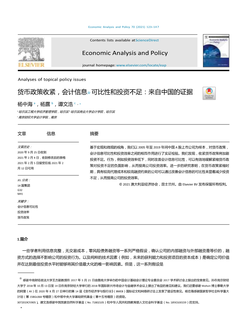 货币政策收紧,会计信息可比性和投资不足:来自中国的证据外文翻译资料