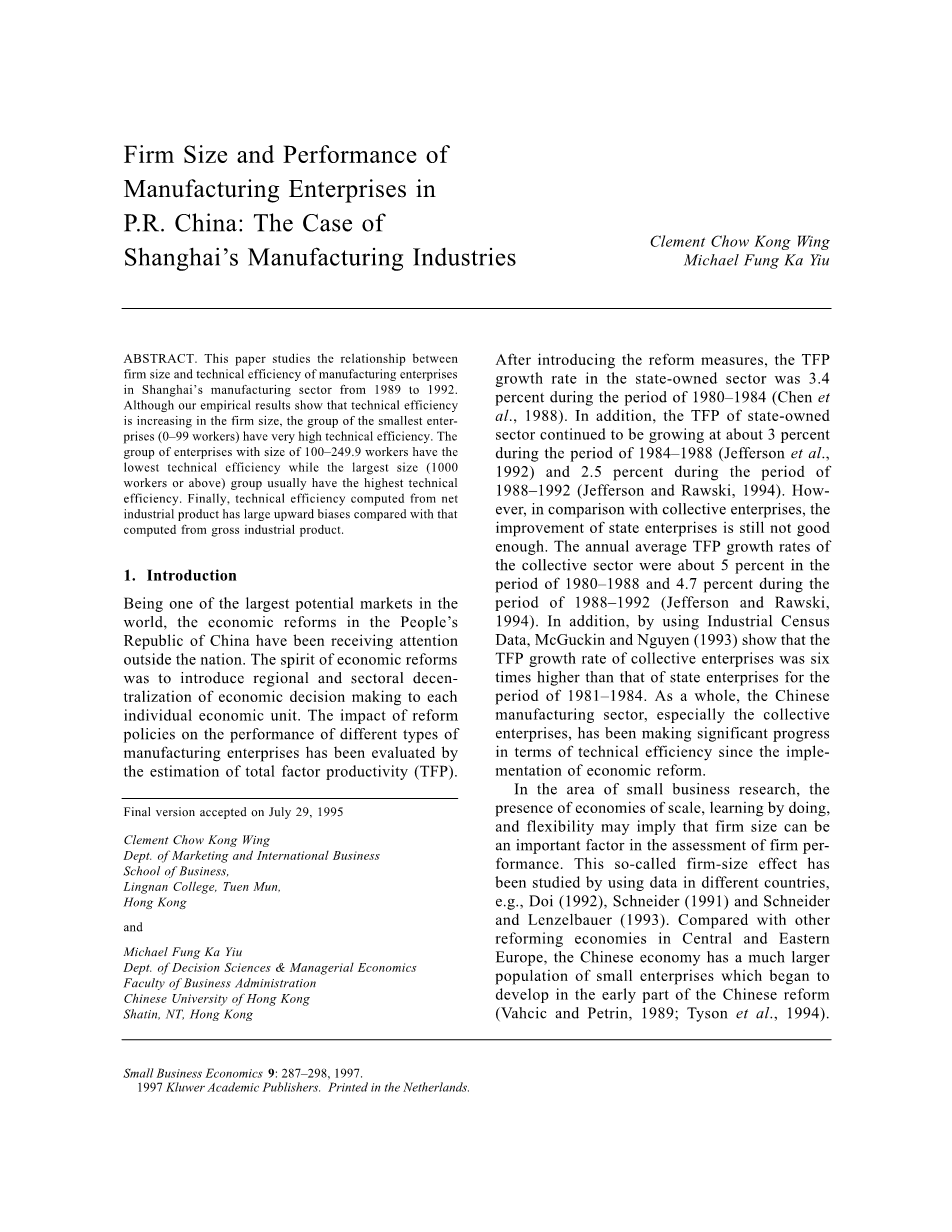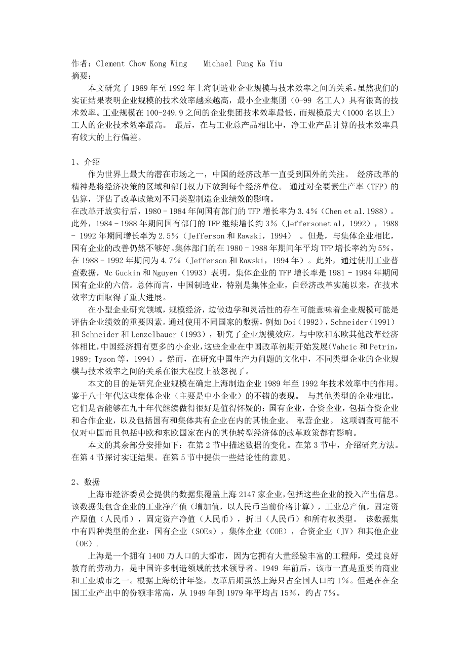 中国制造业企业规模与绩效——以上海制造业为例外文翻译资料
