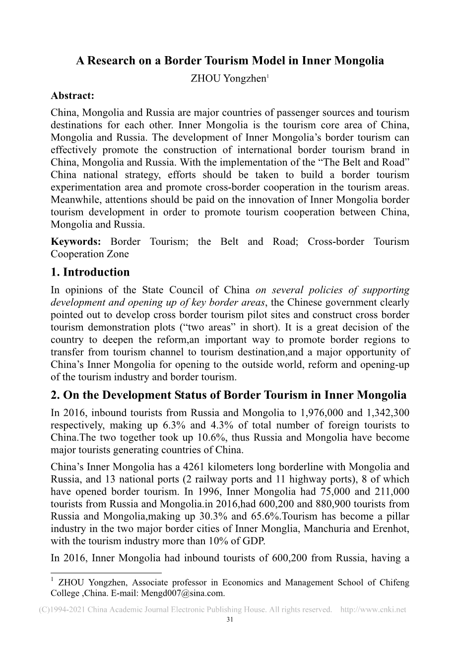 摘要:中国、蒙古和俄罗斯是主要的客运来源和旅游目的地。内蒙古是中国、蒙古 和俄罗斯的旅游核心区。内蒙古边境旅游的发展可以有效促进中国、蒙古、 俄罗斯国际边境旅游品牌的建设。随着“一带一路”国家战略的实施,应努力建立边境旅游试验区,促进旅游业跨境合作。同时,要重视内蒙古边境旅游发展的创新,促进中俄两国的旅游合作。