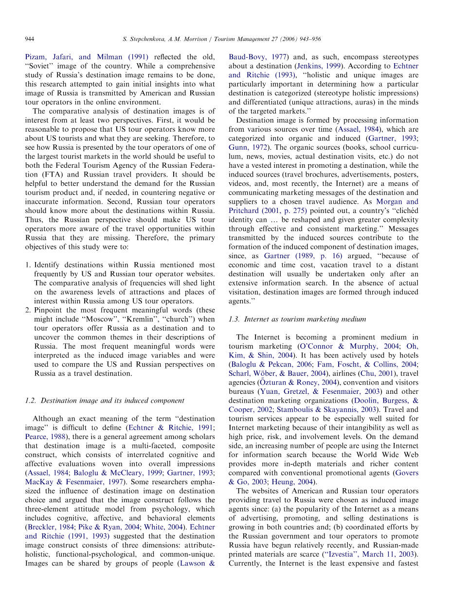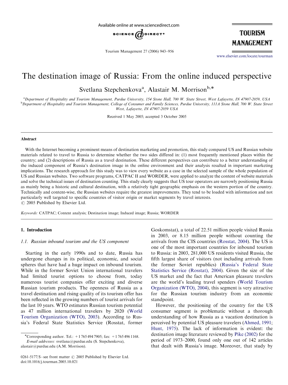 随着互联网成为目的地营销和推广的重要手段,本研究比较了美国和俄罗斯网站上与前往俄罗斯旅游相关的材料,以确定双方在以下方面是否存在差异:(1)国内最常提到的地方;(2)将俄罗斯描述为旅游目的地。这些不同的视角有助于更好地理解网络环境中俄罗斯目的地形象的诱导成分,它们的分析产生了重要的营销影响。本研究的研究方法是将每个网站视为一个案例,在美国和俄罗斯网站的全部人口中选择样本。应用CATPAC II和WORDER软件对网站资料内容进行分析,解决目的地统计的技术问题。这项研究清楚地表明,美国旅游运营商狭隘地将俄罗斯定位为一个主要是历史和文化目的地的国家,在地理上相对紧凑地强调该国的西部地区。在技术和内容方面,俄罗斯网站需要最大的改进。它们往往承载着大量的信息,而不是特别针对特定的游客来源国或旅游兴趣细分市场。