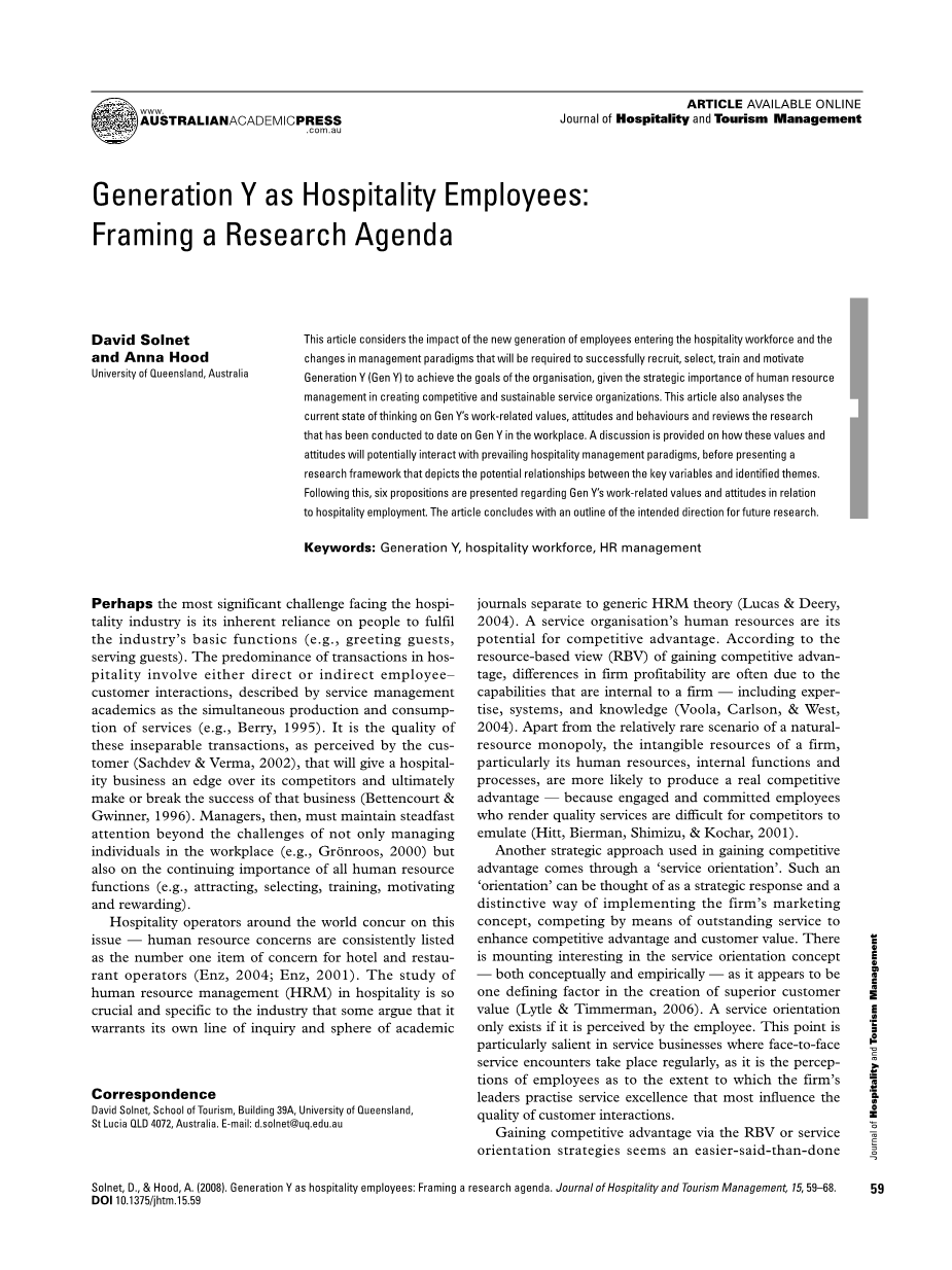 考虑到不断变化的员工人口统计数据和态度、劳动力的供需不平衡、以及不断增长的酒店业务需求,如果酒店组织要通过服务保持竞争优势,似乎需要了解员工价值观、态度和行为的新模式。这篇文章的目的是为对这些问题进行有见地和有益的讨论提供动力,并探析它们对行业的影响以及创建新范例的可能方法。为了做到这一点,我们首先对Y一代员工的思维状态和他们新的工作态度进行了详细的评估,包括回顾对Y一代员工进行调查的学术文献。从那里,我们将考虑这些新出现的态度和工作价值观可能如何与当代的酒店工作场所和普遍的就业条件相互作用。这篇综述将使我们建立一个框架,以理解关键变量之间的关系,如Y一代的工作价值、态度和行为以及酒店组织的内部参数、人力资源管理战略和组织成果。该框架将作为未来研究议程的指南,并将允许我们提出几个关于Y一代员工的陈述,这些陈述将在以后通过实证方法进行严格测试。本质上,这篇文章代表了一个正在进行的研究议程的起点,该议程的最终目的是指出和指导酒店组织可以采用的人力资源实践,以改进Y世代员工的招聘、选拔、培训、激励和保留。