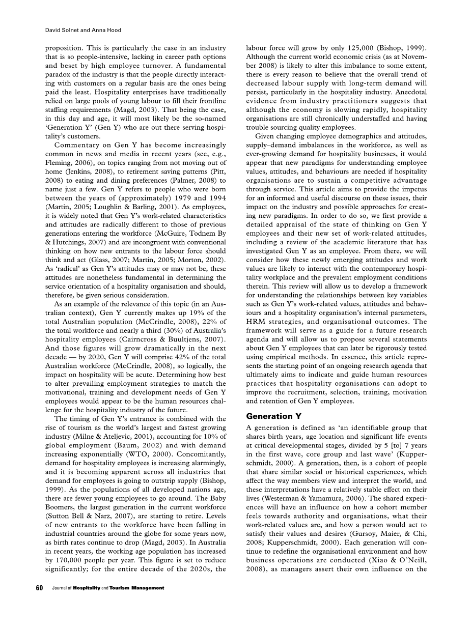 近年来,对Y一代的评论在新闻和媒体中越来越常见(参见,例如,Fleming, 2006),话题从不搬出家(Jenkins, 2008)到退休储蓄模式(皮特,2008年)到饮食和用餐偏好(Palmer, 2008)等等。Y一代指的是出生于1979年(大约)至1994年(Martin, 2005; Loughlin amp; Barling, 2001)的人。作为员工,人们普遍指出,Y一代的工作特点和态度完全不同于进入劳动力市场的前几代人(McGuire, Todnem Byamp; Hutchings, 2007)。并且对于新进入劳动力应该如何思考和行动的传统思维有着不一致的看法(Glass, 2007; Martin, 2005; Morton, 2002).。尽管Y一代的态度可能“激进”,也可能不“激进”,但这些态度在决定酒店组织的服务导向方面仍然是基本的,因此应该得到认真考虑。
