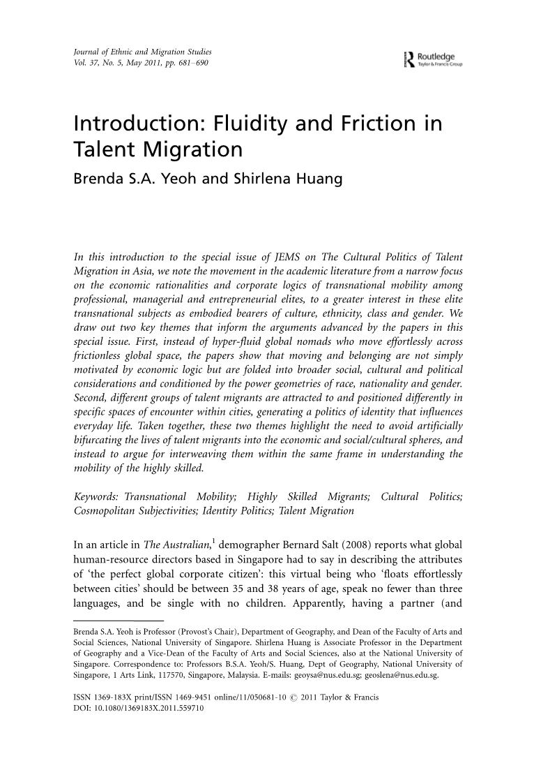 在关于“亚洲人才迁移的文化政治”的JEMS特刊的引言中,我们注意到学术文献从专业,管理和企业家精英之间的跨国流动的经济理性和公司逻辑的重点关注,到对这些精英跨国主题的浓厚兴趣是文化,种族,阶级和性别的具体体现。我们提出了两个关键主题,作为本期特刊中各论文提出的论据。首先,论文表明,迁徙和归属不仅仅是受到经济逻辑的驱使,而是被纳入更广泛的社会,文化和政治考虑因素中,并受到种族权力几何条件的制约,而不是那些动荡不安的全球游牧民毫不费力地在不摩擦的全球空间中移动。其次,不同的人才移民群体在城市中的特定相遇空间中被吸引并定位不同,从而产生了影响日常生活的身份政治。综上所述,这两个主题突出表明,有必要避免人为地将人才移民的生活分为经济和社会文化领域,而是主张在理解高技能人才流动性的同时将他们交织在一起。