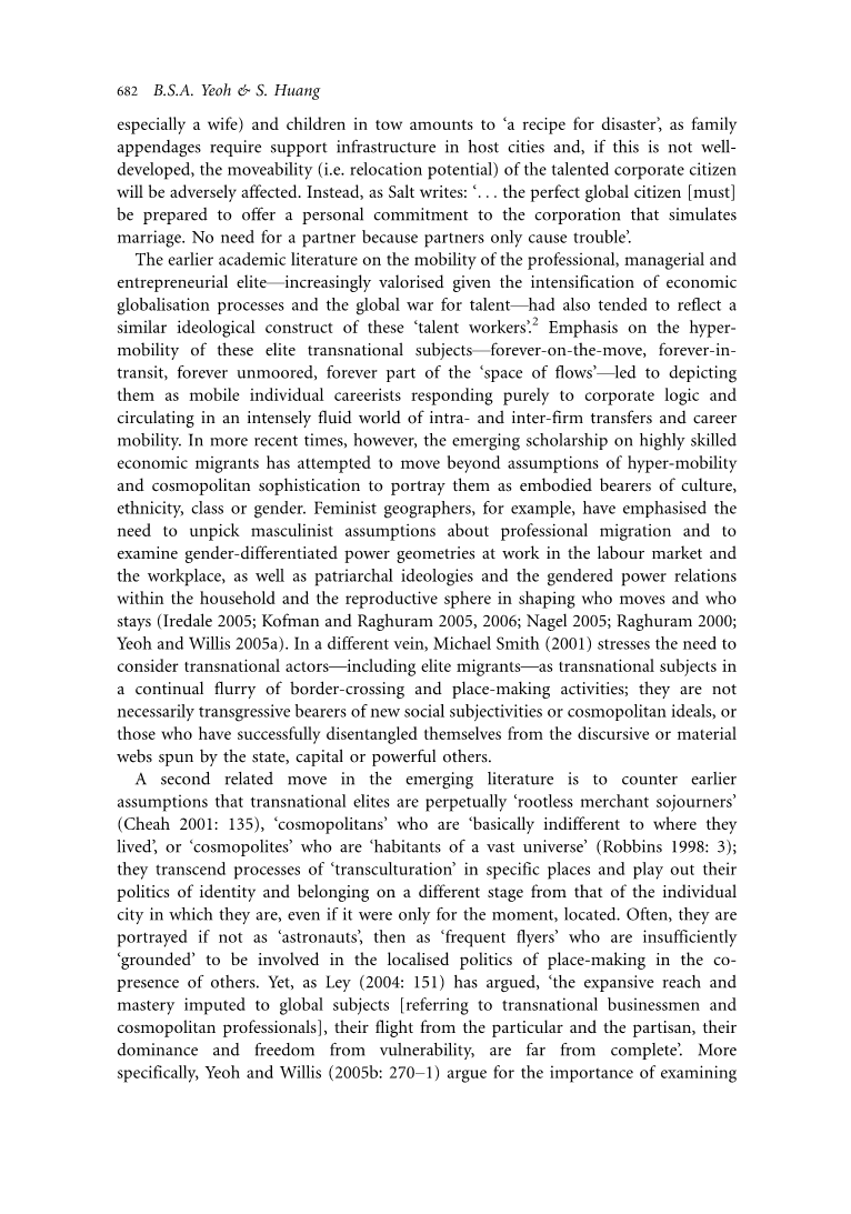 新兴文献中的第二个相关举措是反驳先前的假设,即跨国精英永远是“无根商人寄居者”,“基本上对居住地漠不关心” “世界主义者”或“大都会主义者” “广阔宇宙中的居民”,他们超越了特定地方的“换文化”过程,发挥了自己的身份和归属政治,与他们所处的单个城市处于不同的阶段(即使只是暂时的)。通常,他们被描绘成不是“宇航员”,然后被描绘成没有足够“扎根”以参与本地化的“常客”,与他人共处的场所营造政治。然而,正如莱伊所论证的那样,“全球主题的广泛影响力和掌握力(指的是跨国商人和世界性专业人士),他们脱离特定群体和游击党,他们的统治地位和不受伤害的自由还很遥远。更具体地说,Yeoh和Willis认为,研究高技能的跨国移民与“接触区”建设有关的文化政治的重要性。