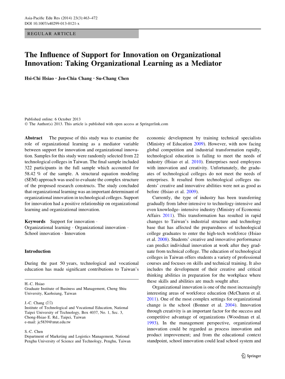 摘要:本研究的目的是探讨组织学习作为创新和组织创新的支持之间的中介变量。本研究的样本从台湾市22所技术院校中的随机选择。最后的样本包括322名参与者中的全部样本,占58.42%的样本。结构方程模型(SEM)的方法是用来评价所提出的研究结构的复杂结构。这项研究认为,组织学习是组织创新的重要决定因素技术学院。支持创新的组织学习与组织创新有着积极的关系。