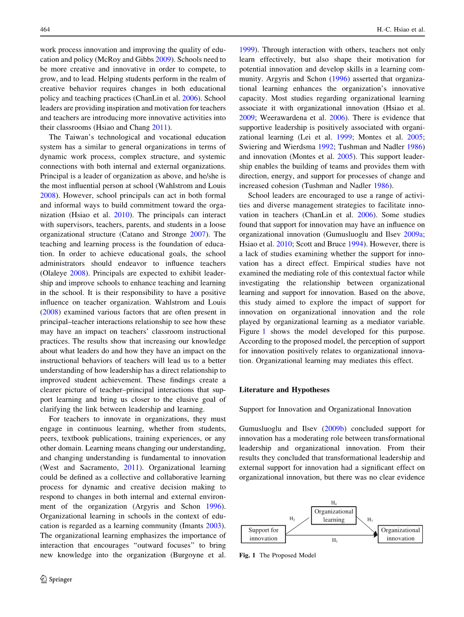 对于教师在组织创新,他们必须进行连续的学习,无论是从学生,同行,教科书出版物,培训经验,或任何其他领域。学习方式改变我们的认识,不断变化的认识是创新的根本(West and Sacramento, 2011)。组织学习可以被定义为一个集体和合作学习过程为了进行动态的和创造性的决策来应对在组织内部和外部的环境变化(Argyris and Schon 1996)。在该学校教育方面,组织学习可以看作是一个学习社区(Imants 2003)。组织学习强调互动,鼓励“向外集中”给组织带来新的知识(Burgoyne等人1999)。通过与他人的互动中,教师不仅能有效学习,但也塑造他们潜在的创新和发展学习型社区的技能的动机,。Argyris and Schon(1996)认为组织学习能提高组织的创新能力。大多数关于组织学习的研究与组织创新有关联(Hsiao 等.2009;Weerawardena。2006)。有证据表明,支持型领导与组织学习和创新是相关的(Lei等 1999;Montes等 2005;swiering and wierdsma 1992;Tushman and Nadler 1986)(Montes等 2005)。这种支持型领导能使队伍建设,为他们提供方向,能源,并支持变革和提高凝聚力(Tushman and Nadler 1986)。