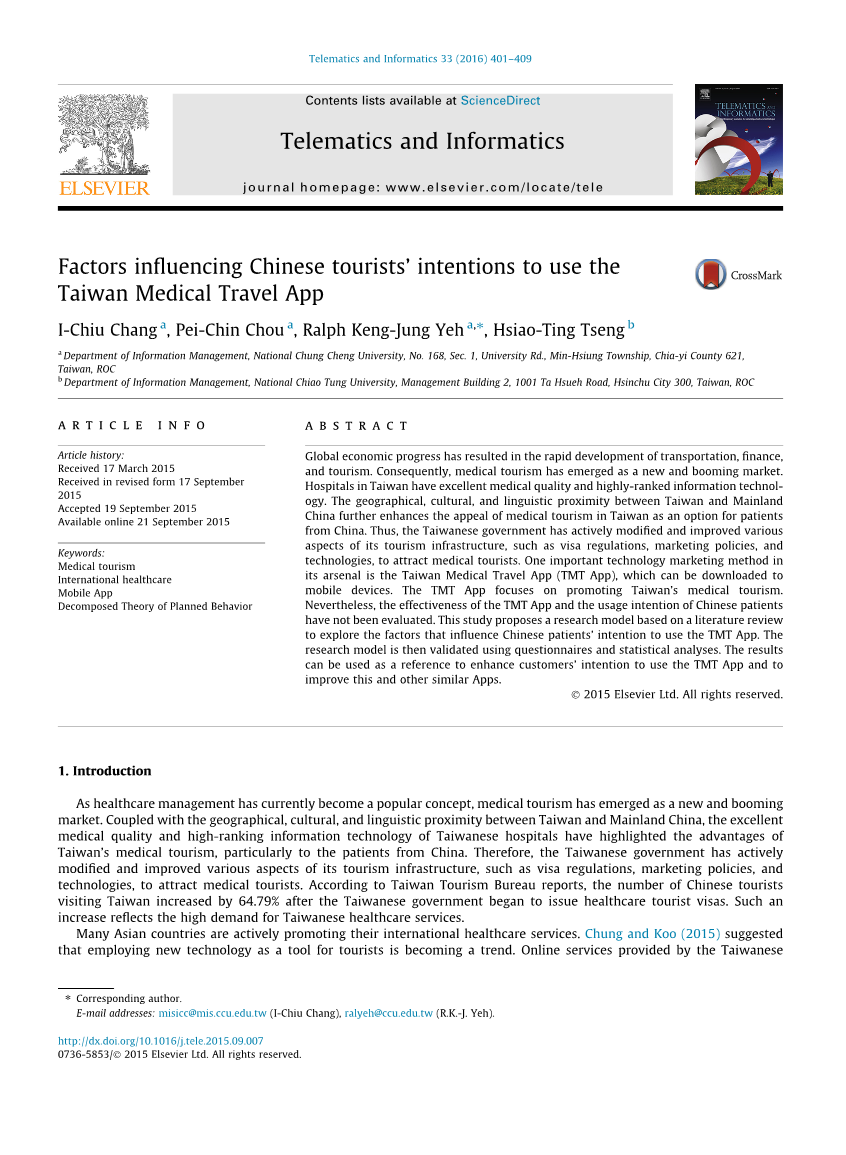 摘要:全球经济的进步导致了交通、金融、和旅游业。因此,医疗旅游已经成为一个新的和蓬勃发展的市场。台湾医疗有优秀的医疗质量和高排名的信息。台湾和大陆在地理、文化和语言上的接近中国进一步提高了台湾医疗旅游作为患者选择的吸引力来自中国。因此,台湾政府积极地修改和改善各种政策旅游基础设施方面,如签证规定、营销政策等科技,吸引医疗游客。一种重要的技术营销手段它的武器库是台湾医疗旅行应用(TMT应用),可以下载到