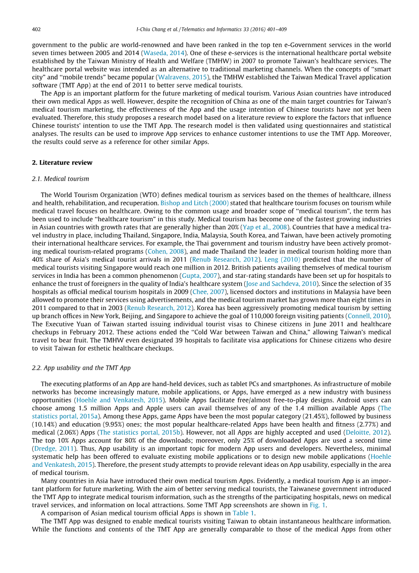 许多亚洲国家正在积极推广其国际医疗保健服务。Chung and Koo(2015)提出利用新技术作为旅游工具正成为一种趋势。台湾政府向公众提供的网上服务享誉全球,并已跻身全球十大电子政府服务之列2005年至2014年之间有7次(早稻田,2014年)。其中一个电子服务是国际医疗保健门户网站由台湾厚生劳动省(TMHW)于2007年成立,以推广台湾的医疗服务。的