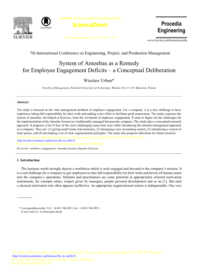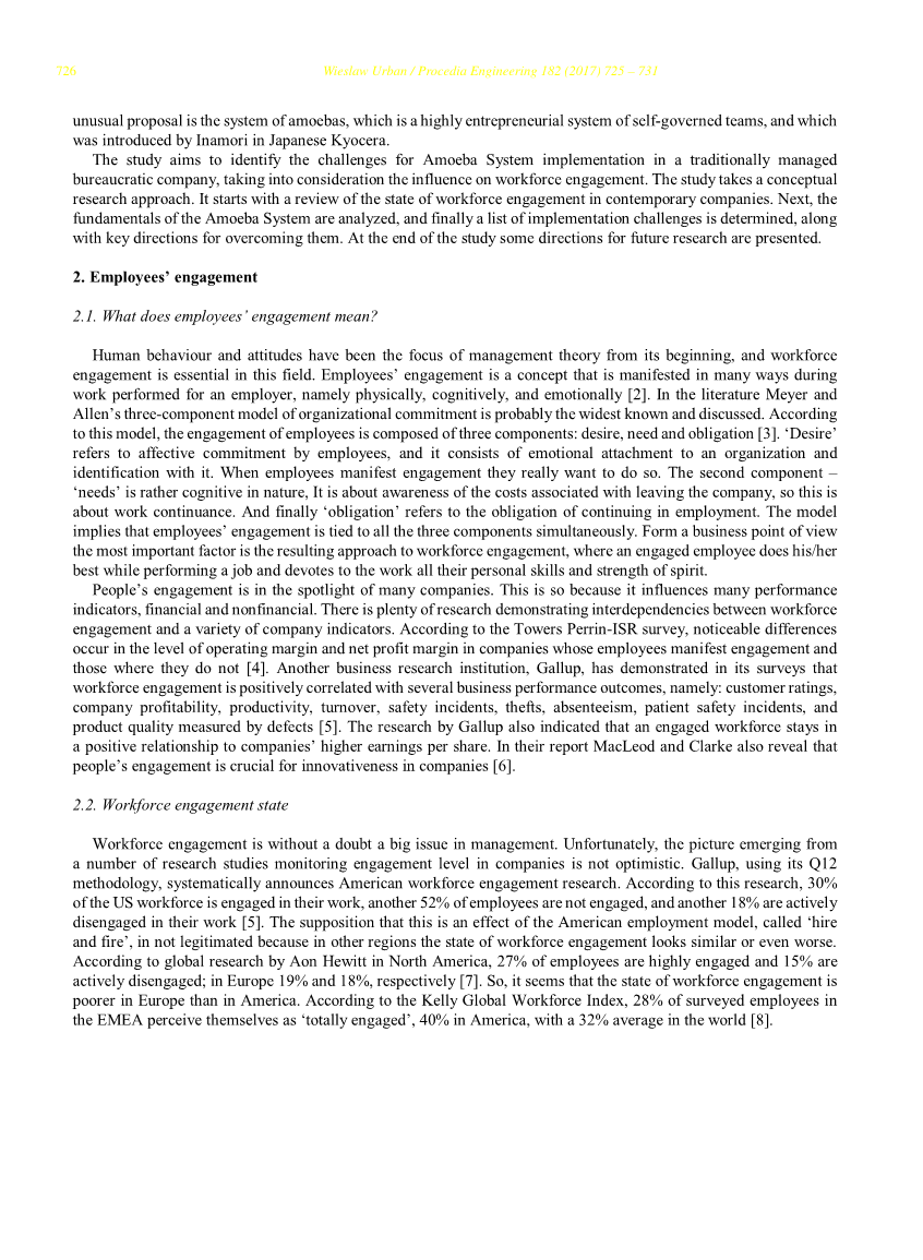 该研究旨在确定在传统管理的官僚公司中实施阿米巴系统的挑战,同时考虑到对员工敬业度的影响。该研究采用了概念研究方法。它首先回顾了当代公司的员工敬业度状况。接下来,分析阿米巴系统的基本原理,最后确定实施挑战的列表以及克服这些挑战的关键方向。在研究结束时,提出了一些未来研究的方向。